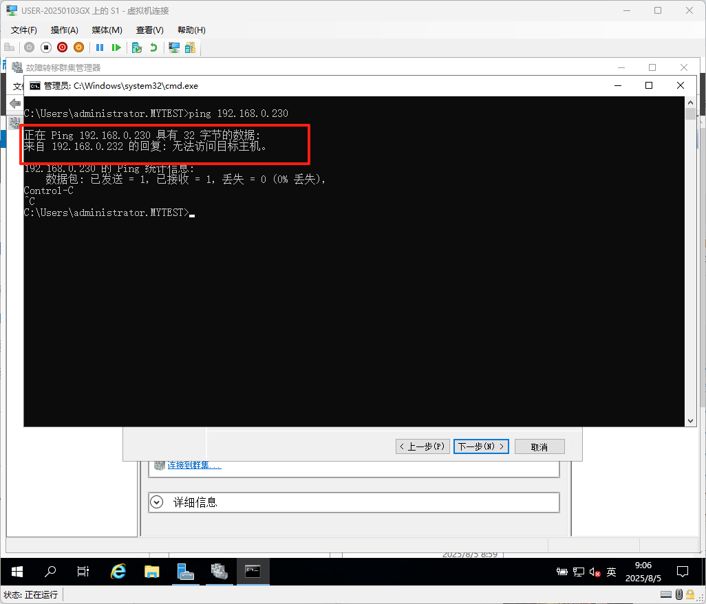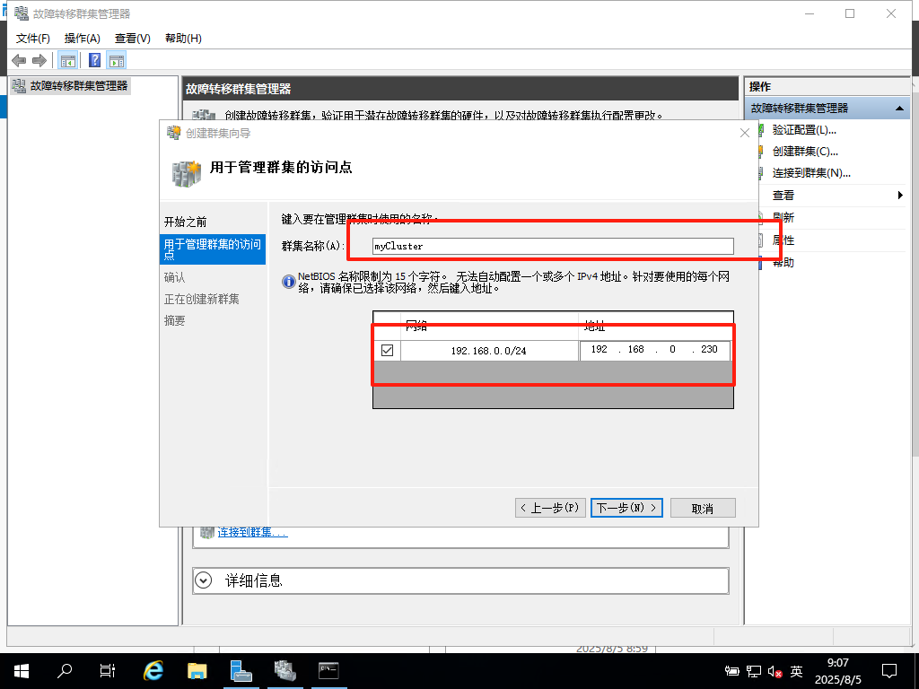 输入集群名称,找一个没用的IP作为集群Ip配置,此处我设置为230