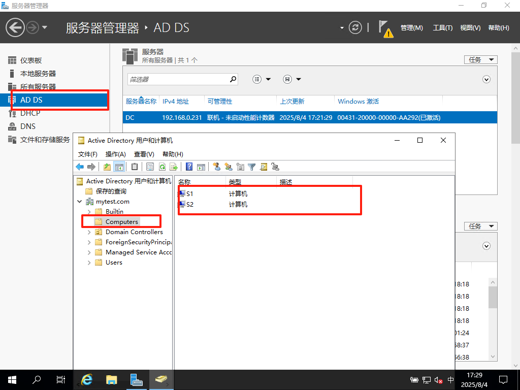 通过此时登录DC服务器能够查看和管理域下的计算机