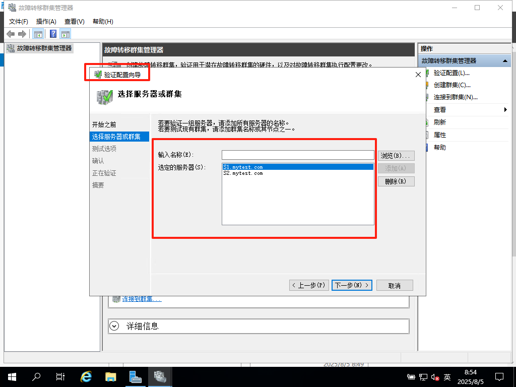 打开验证安装向导,将需要加入集群的服务器添加到列表,下一步到群集测试
