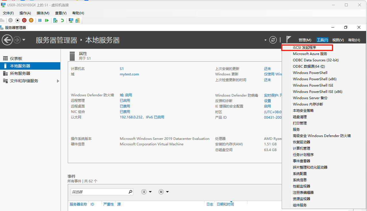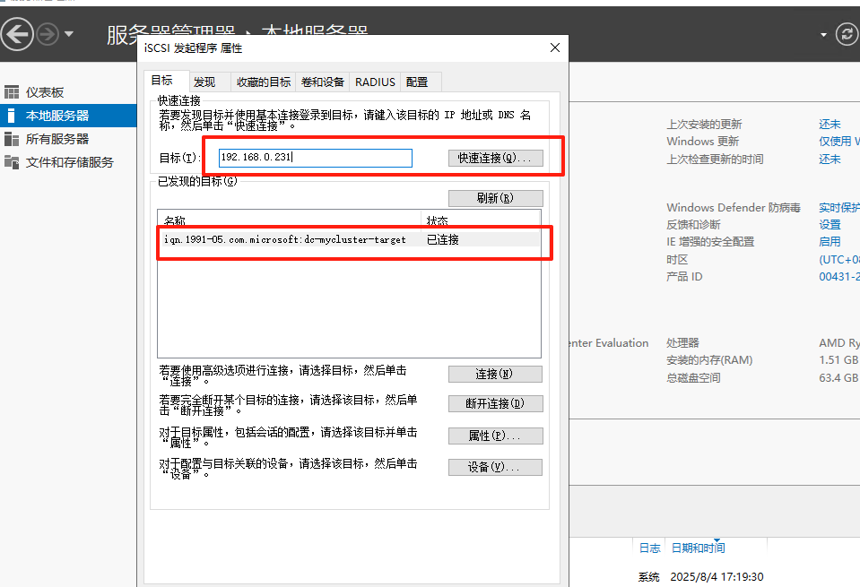 通过iSCSI发起程序打开属性对话框,输入IP或域名链接共享磁盘.