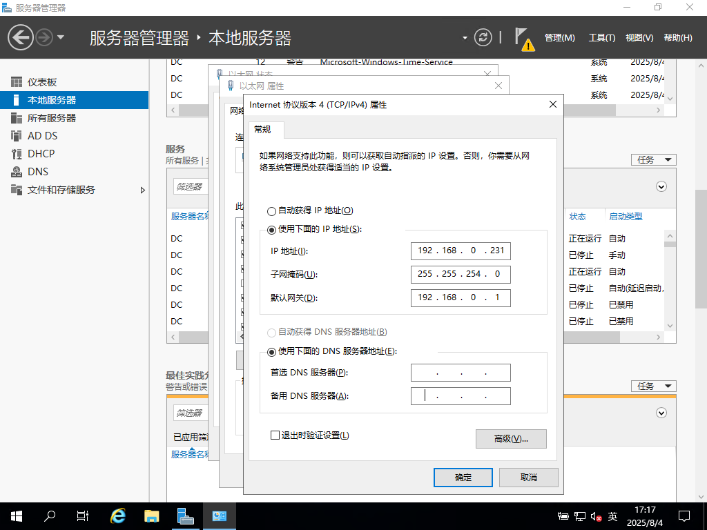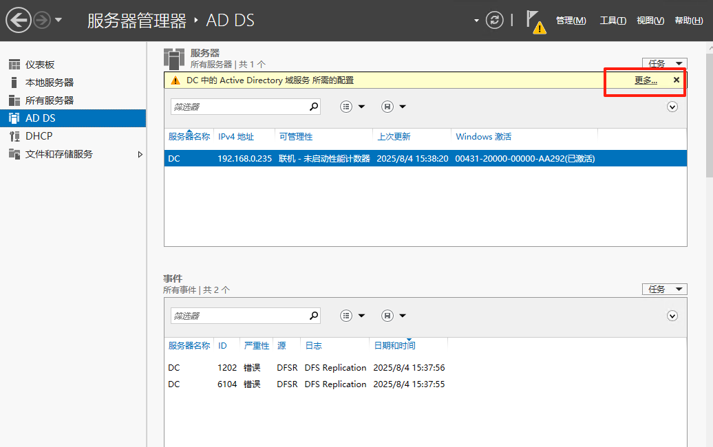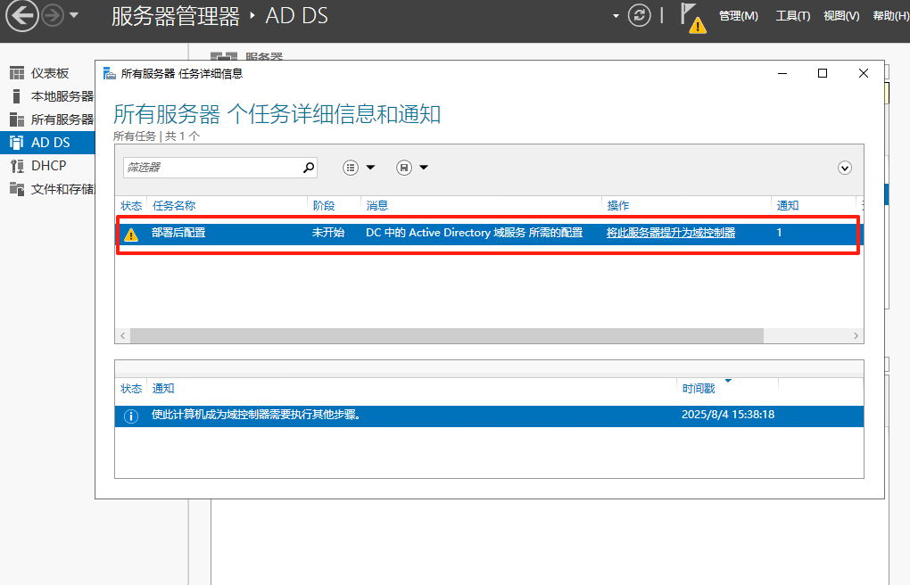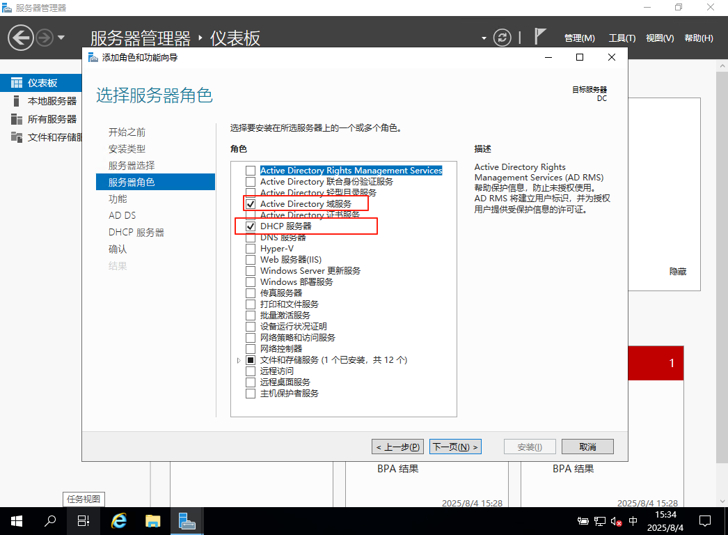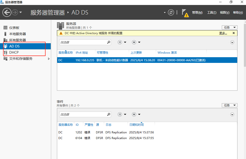 我们得安装Active Directary服务和DHCP服务,安装后服务管理器面板出现"AD DS"和"DHCP".