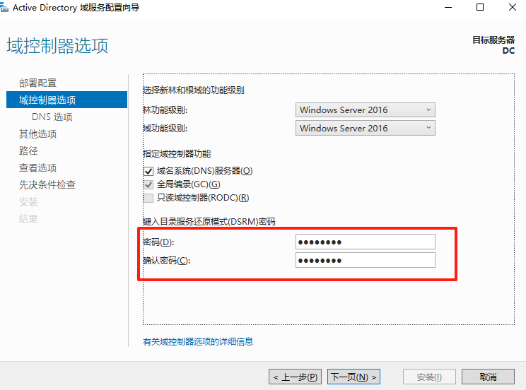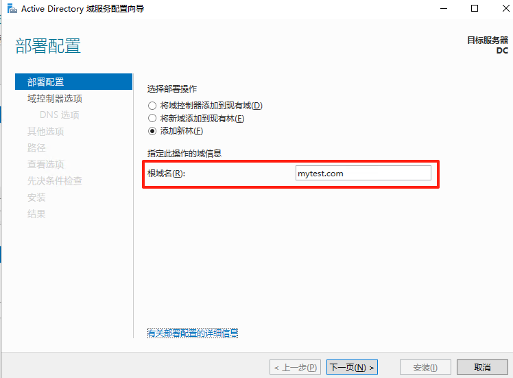 打开域服务配置向导,自定义根域名,输入自定义模式密码,然后下一步