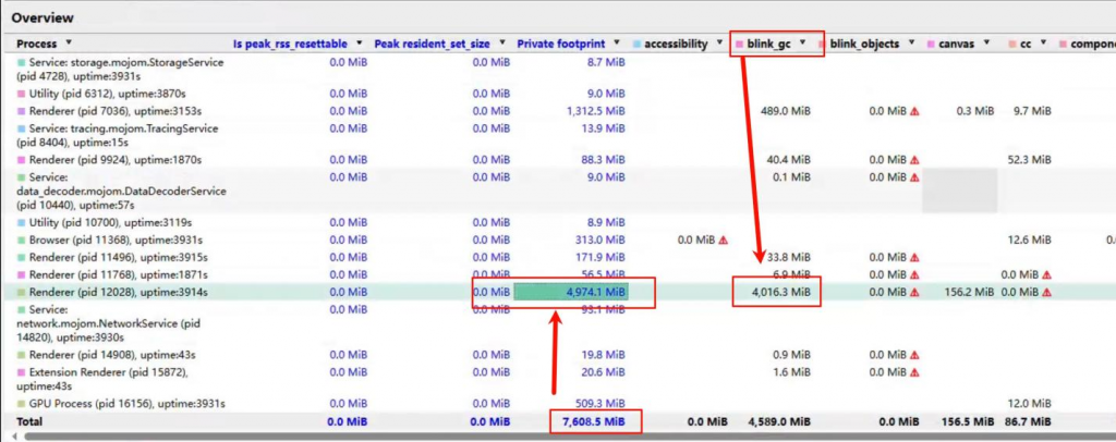 在本案例中,机器总内存高达 64GB,资源充裕,Chrome 判断无需迫切回收。为避免不必要的性能开销(一次完整的 GC 会消耗 CPU 资源),GC 选择推迟回收操作。因此,我们看到的 4GB 占用,实际上是 Oilpan GC 持有的一个较大的内存池,其中包含了活动对象和大量待回收的“垃圾”对象。只要这个内存池的大小趋于稳定,没有出现持续、无节制的增长,通常就不构成内存泄漏问题。