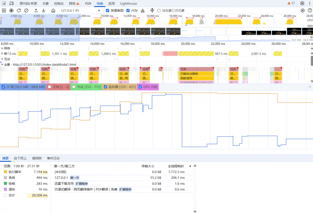在实验操作前,我们可以打开 Chrome DevTools -> Performance (性能) 面板,并且点击面板中的录制按钮,记录整个实验过程,这能帮助我们在操作结束后,回溯并分析全程性能和内存的变化情况。