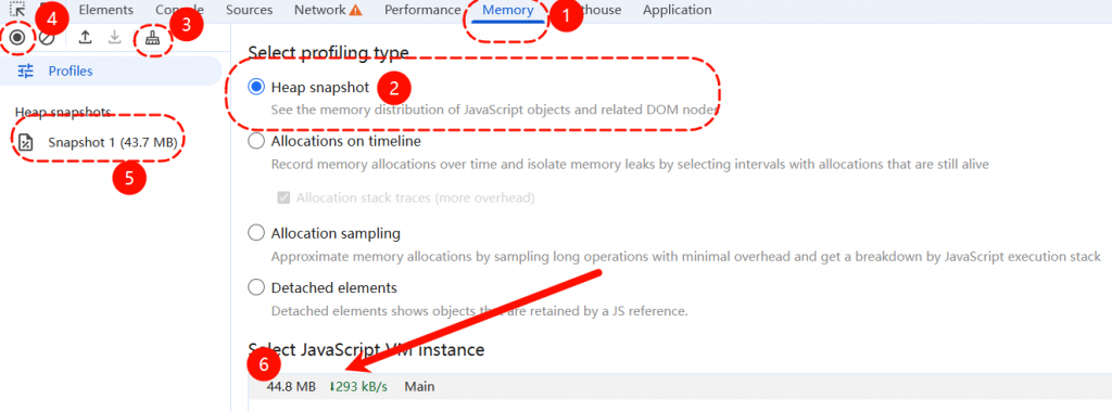 2.在生成快照前,需要先点击上图中的 ③ 号按钮(强制垃圾回收),待完成一次 GC 后,再点 ④ 号按钮生成快照。这样做的原因是,我们的核心目标是排查内存泄漏问题,强制 GC 能释放原本应该被回收的资源,这会让快照结果更加直观地显示出问题。