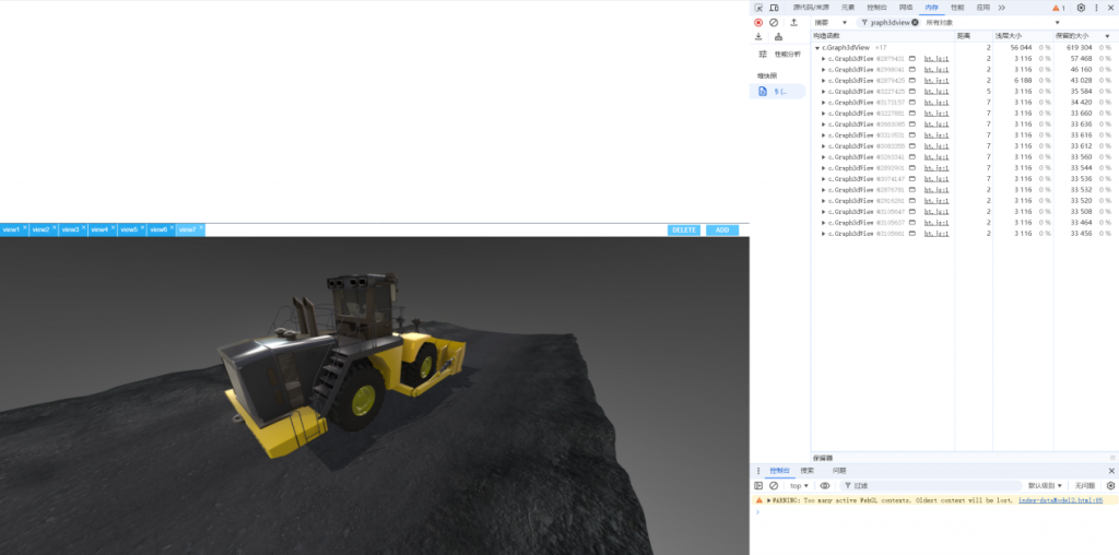 我们通过按钮不断创建新的视图,当页面中超过一定数量Graph3dView 时,可以看到第一个场景“崩溃”,但是当我们删除最后一个 Graph3dView 后,第一个场景又恢复了。