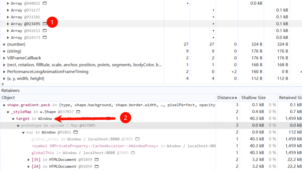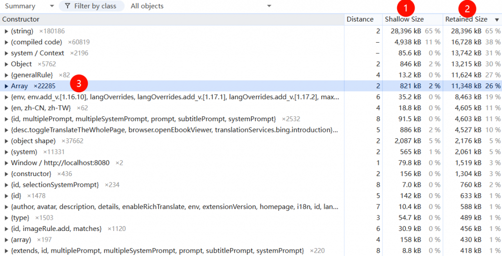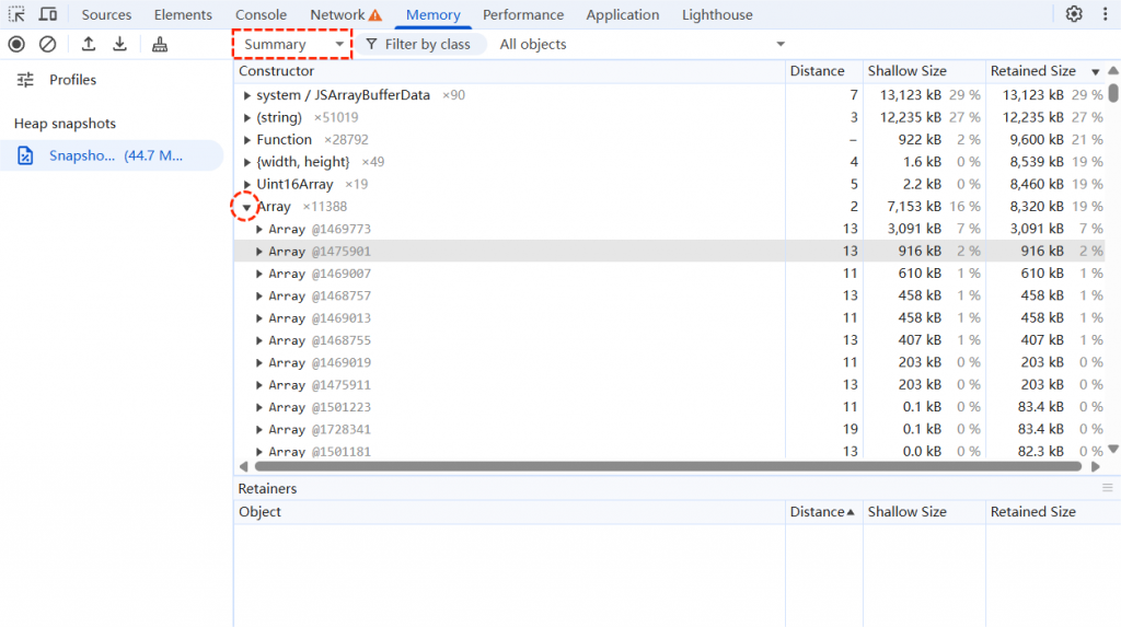 在上图所示的摘要中,每一项都支持展开,展开后可以看到对象的完整引用链。摘要面板适合的运用场景:当单次 Profile 已显示出大量的内存占用时,可先按 Retained Size 对列表进行排序,快速定位到占据了过高的内存的项,展开其中的可疑目标并一路追溯,直到找到根源 —— 通常是挂载到全局 windows 对象上的变量,或被闭包捕获的变量。