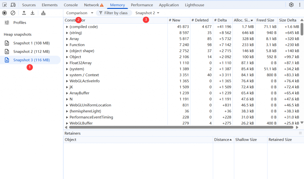 在完成以上的操作步骤后,选择第三个快照,并在顶部的视图选择器中(下图 ②),将视图模式从 Summary 切换为 Comparison,比较对象选择为快照 2(下图 ③)。现在视图只会显示快照 2 和快照 3 之间发生变化的对象。操作后需要关注以下内容: