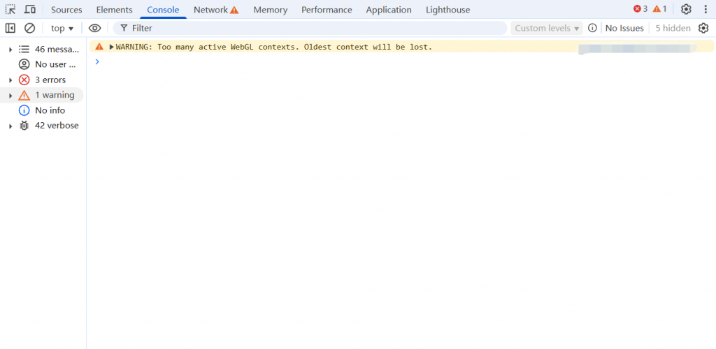当 WebGL Context 超出限制,浏览器会采取强制措施:丢弃“最近最少使用”的那个 WebGL 上下文,并在控制台输出一条警告,如:“WARNING: Too many active WebGL contexts. Oldest context will be lost.”(警告:活动 WebGL 上下文过多。最旧的上下文将被丢弃。)。对于那些未预料到此行为的应用而言,这可能导致灾难性的渲染失败,且问题难以追踪。