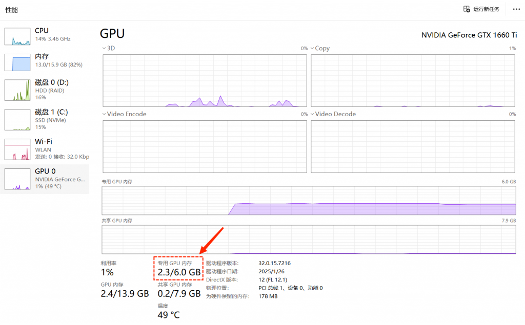 查看这类资源占用,通常需要观察系统显卡的显存使用情况。以 Windows 系统为例,可以通过:「任务管理器 → 性能 → GPU → 专用 GPU 内存」这一路径,直观地看到显存占用的变化趋势。以一个 6G 显存的 GPU 为例,尽量将显存占用控制在合理范围(譬如 5G 以内,避免超过 5.5G),否则一旦超标,系统可能会强制回收显存资源。