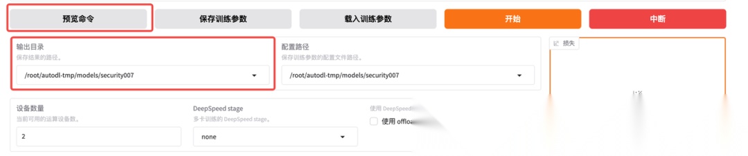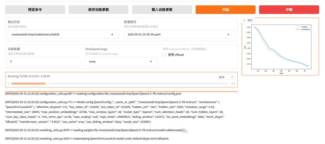微调过程中,我们可以通过右下角的 LOSS 曲线来简单观测整个微调过程。