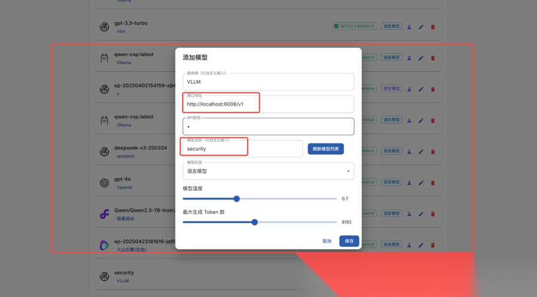 为了方便验证和对比模型微调后的效果,我们在 Easy Dataset 提供的 Playground 进行测试,这里我们使用 VLLM 部署的服务(不损失精度、推理速度更快),我们在模型配置中添加这个模型。这里只有接口地址、模型名称是要准确填写的,提供商、API 密钥可以随意填写: