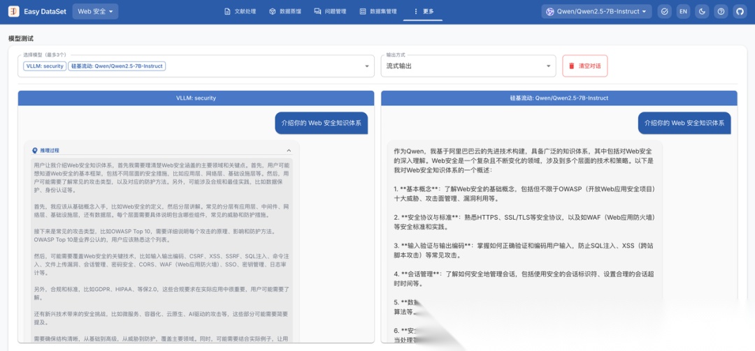 然后这里我们使用硅基流动提供的 Qwn2.5-7B-Instruct 作为基础模型,和微调后的模型(Security)进行对比: