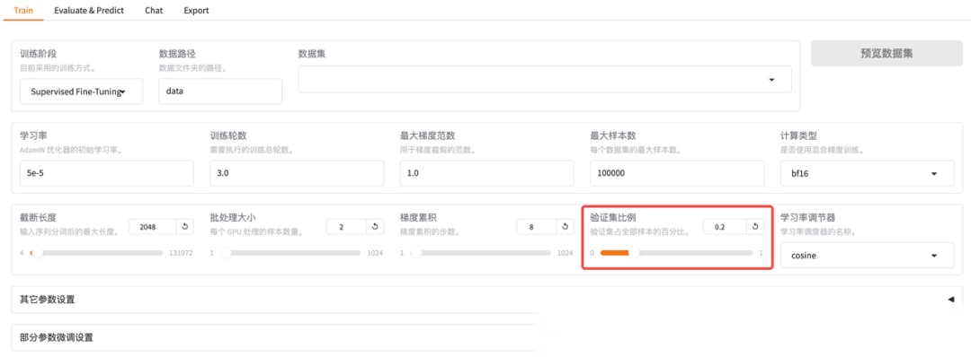 当我们在微调参数中设定了一定的验证集比例,将会多生成一条 Eval LOSS 曲线,体现模型在验证集上的表现。