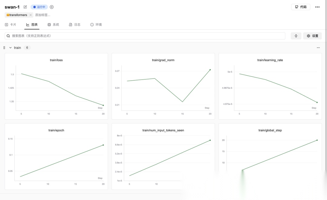 在 LLaMA Board 中,我们只能看到简单的 LOSS ,如果想看到更多维度的指标,可以通过 SwanLab、TensorBoard、Wandb 等可视化工具,这里我是用的是 SwanLab。