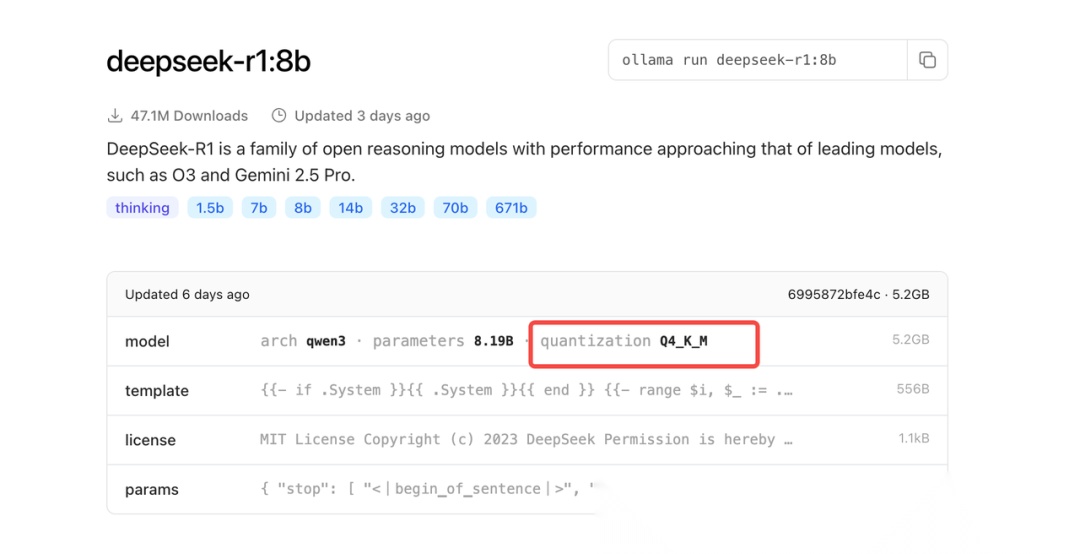 相比于默认的 BF16 精度(每个参数占用 16 位(2 字节)),4BIT 量化(每个参数仅占用 4 位(0.5 字节))可以将模型推理的显存占用降低 75%。所以使用 Ollama 运行 7B 的模型大概仅需要 4G 显存(考虑到其他开销实际可能更大一点)。但是量化后的模型也就意味着会损失一定精度,这也是为什么大家在使用 Ollama 运行模型总觉得会比和其他方式运行模型变得 “更傻” 的原因。