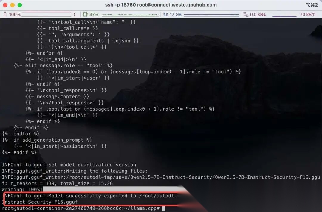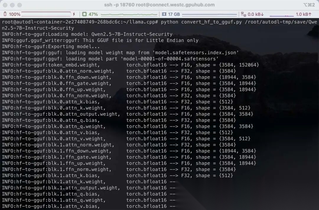 转换成功后,将在微调后合并的模型目录下生产一个 GGUF 文件(/root/autodl-tmp/save/Qwen2.5-7B-Instruct-Security/Qwen2.5-7B-Instruct-Security-F16.gguf):