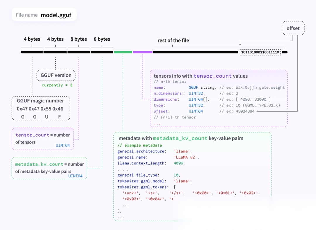 GGUF(GGML Universal File)是专为大型语言模型(LLM)设计的文件格式,其优化了数据的存储方式,减少了存储空间的占用,这对于包含大量参数的大型模型尤为重要。