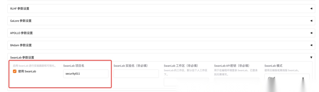 在 LLaMA Facroty 中国为 SwanLab 单独开了一个 Tab,可以选择启用,并填写一个项目名称: