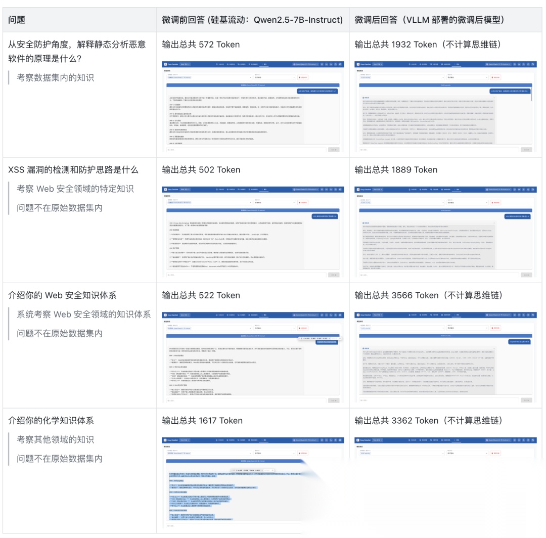 • 在 Web 安全领域的特定问题上(不在数据集内),具备推理能力,并且回答结果更丰富,说明模型的泛化能力较好,没有过拟合;