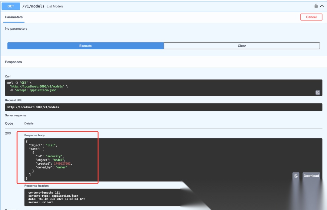 我们尝试获取模型列表,可以看到返回了我们指定好的 security 模型:
