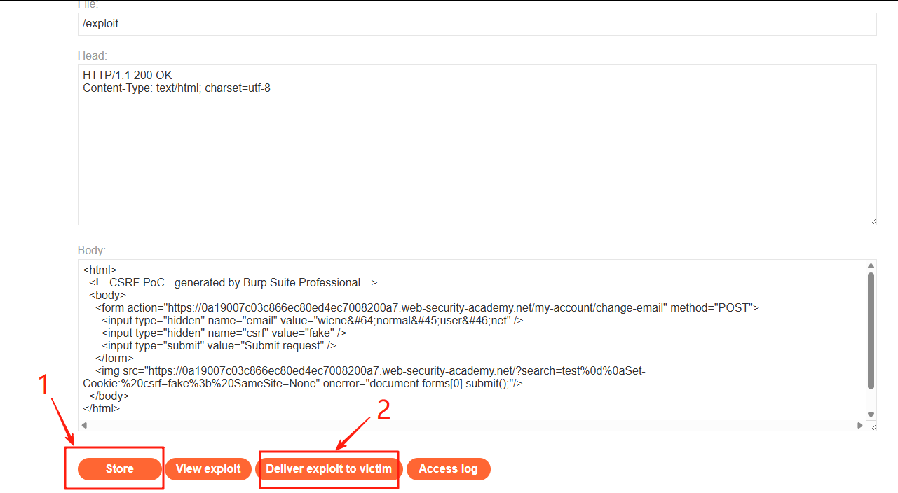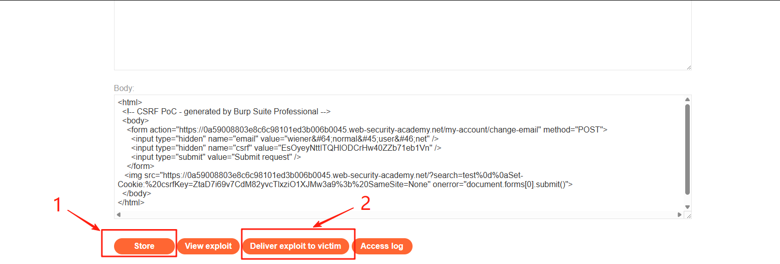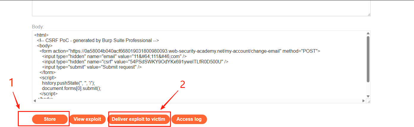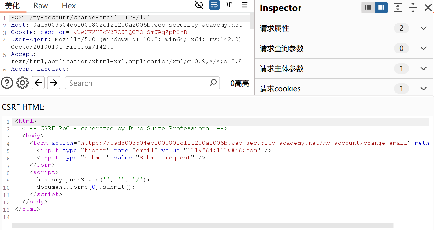 成功绕过了 csrf 检测。所以我们只要用自己的账号拿到一个合法的令牌,就可进行 CSRF 攻击。此时重新抓一个账号的包,发送到 Repeater ,然后将包丢弃(一定要丢弃,因为令牌是一次性的,用过的令牌无法再用)。生成PoC写入靶场提供的服务器,发送给受害者
