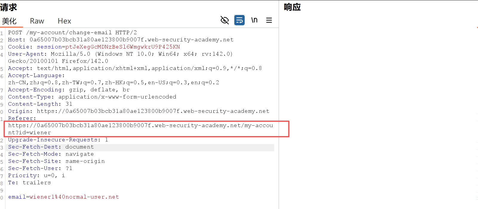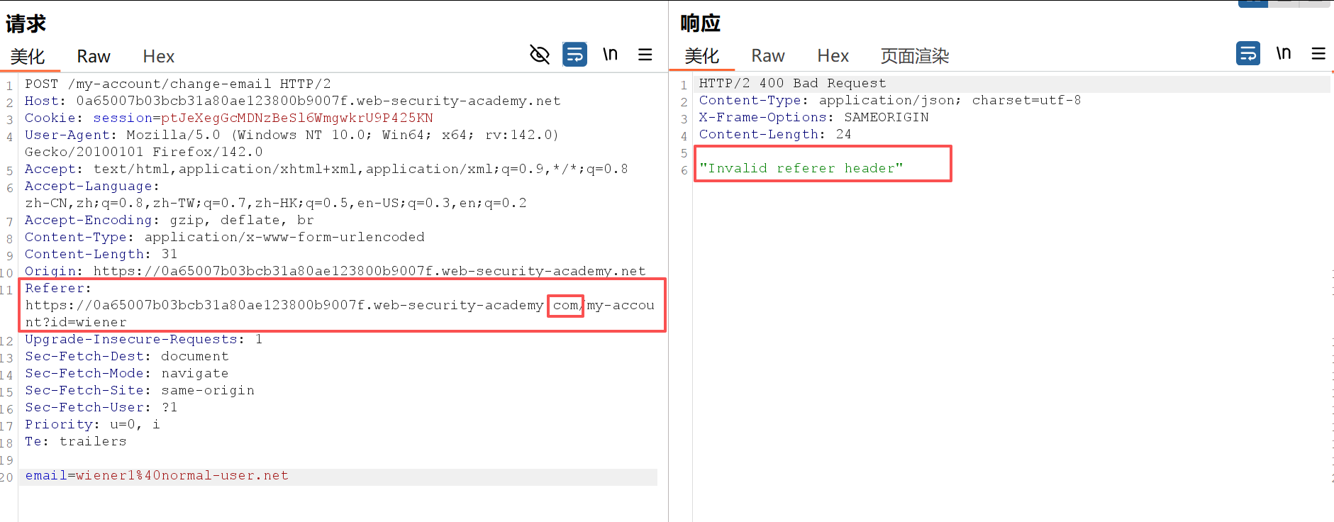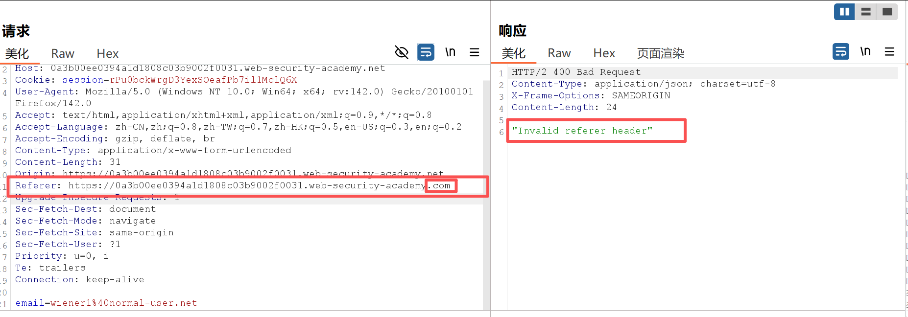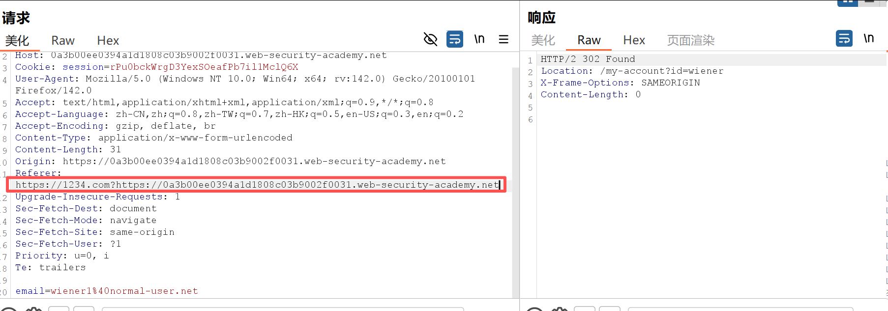 进入网页,登录靶场提供的账号,然后更新邮箱地址,用 BP 抓到该请求包。更改 Referer HTTP 标头中的域,发现请求被拒绝