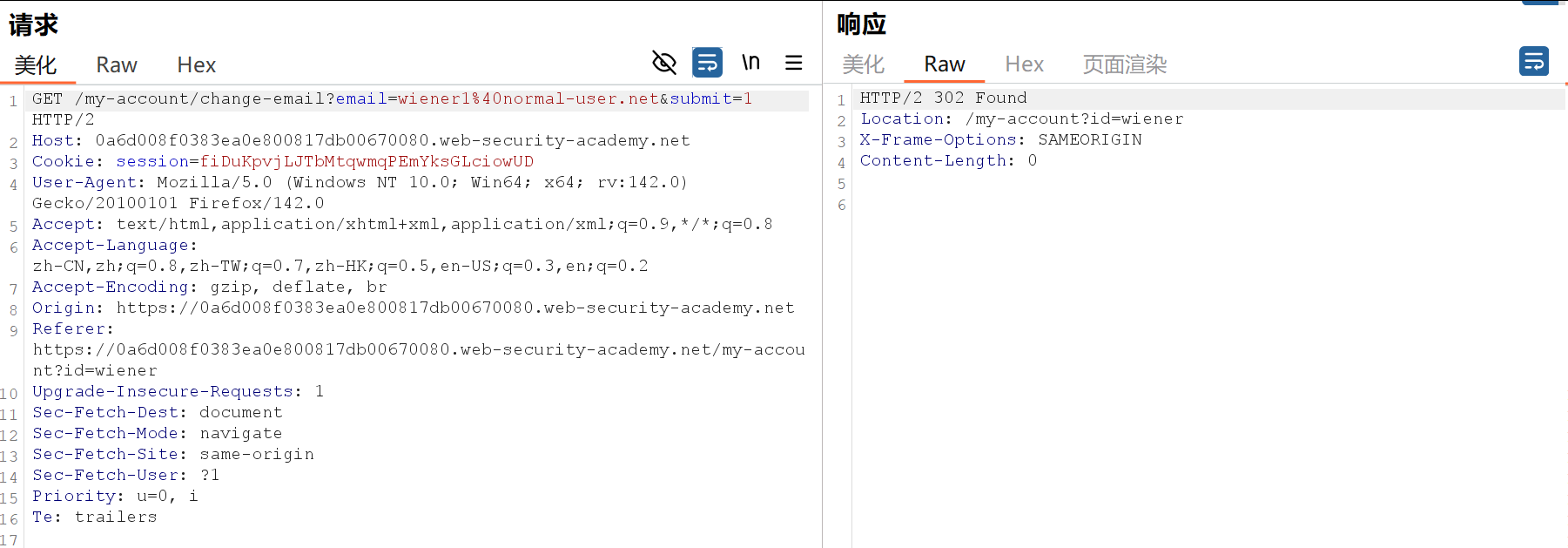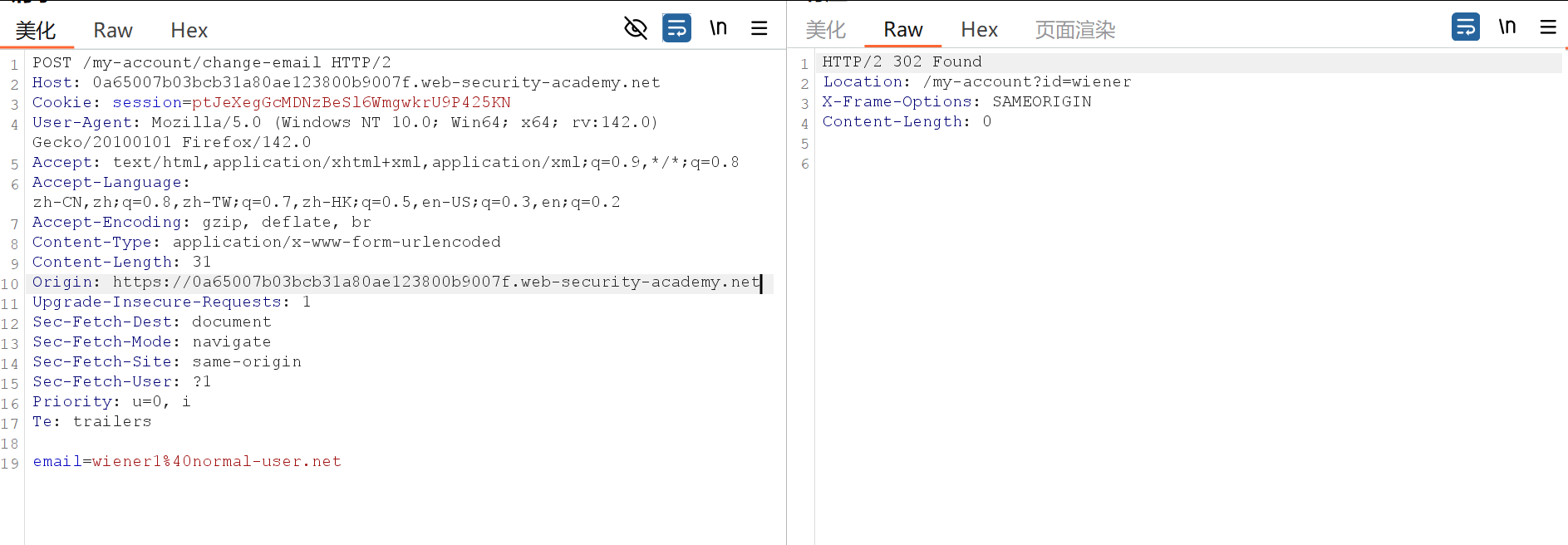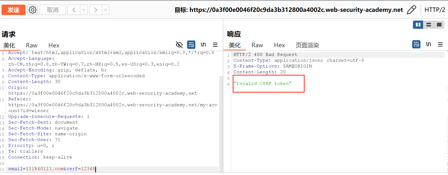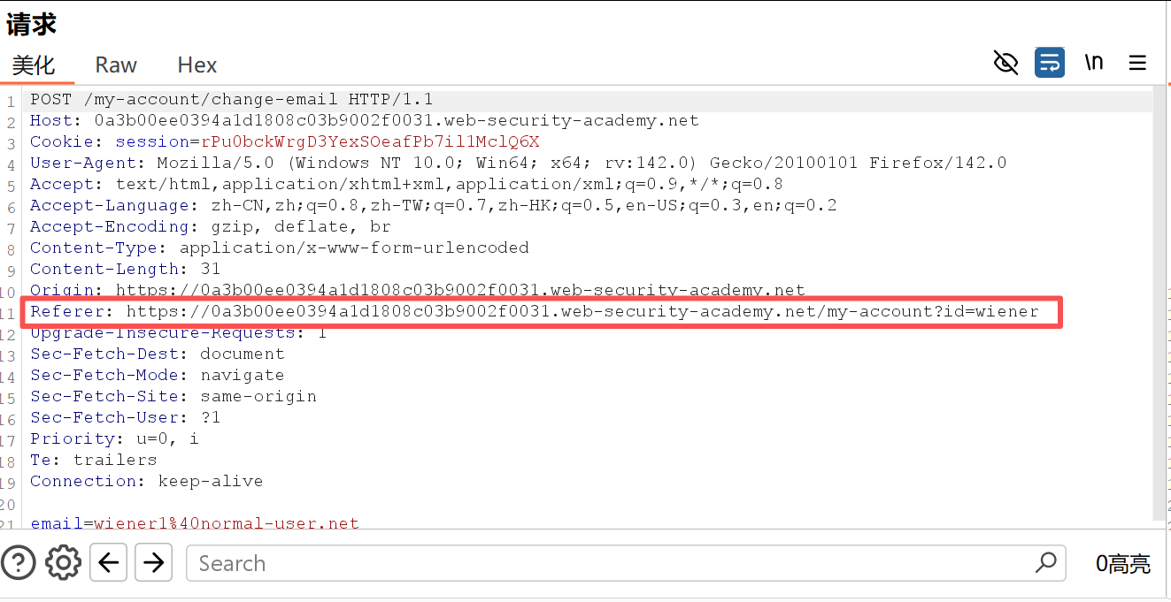 进入网页,登录靶场提供的账号,然后更新邮箱地址,用 BP 抓到该请求包。更改 Referer HTTP 标头中的域,发现请求被拒绝