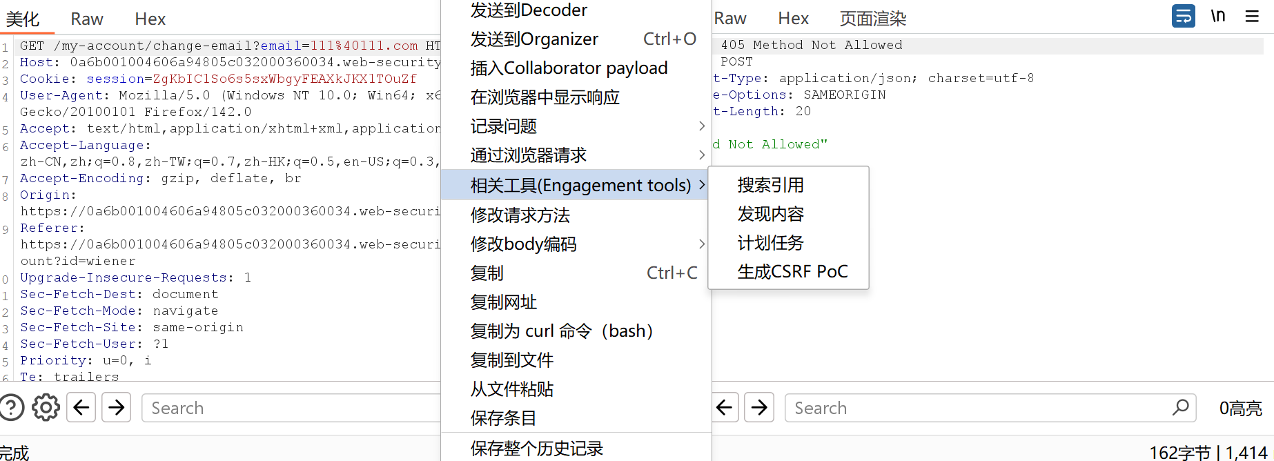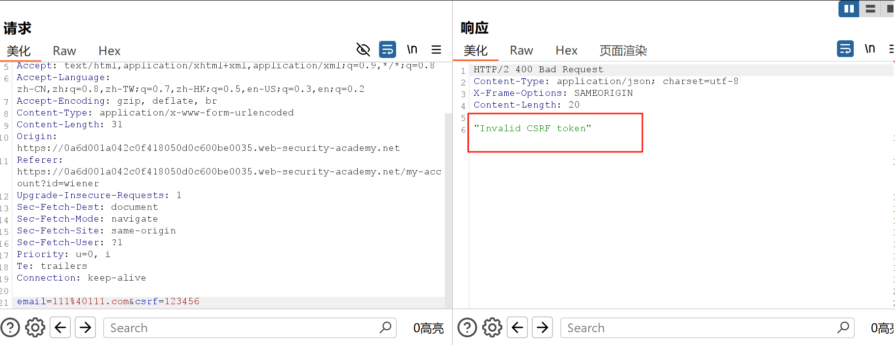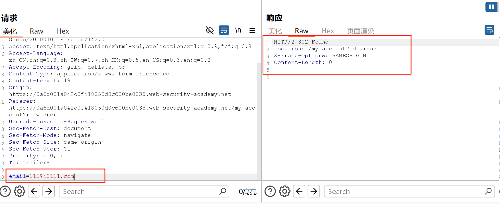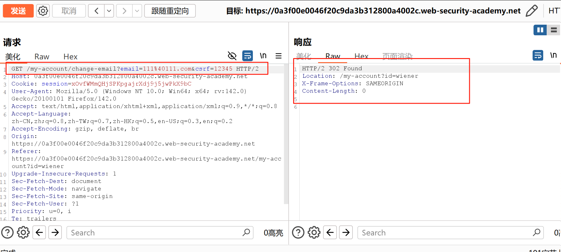 进入网页,登录靶场提供的账号,然后更新邮箱地址,用 BP 抓到该请求包。更改 Referer HTTP 标头中的域,发现请求被拒绝
