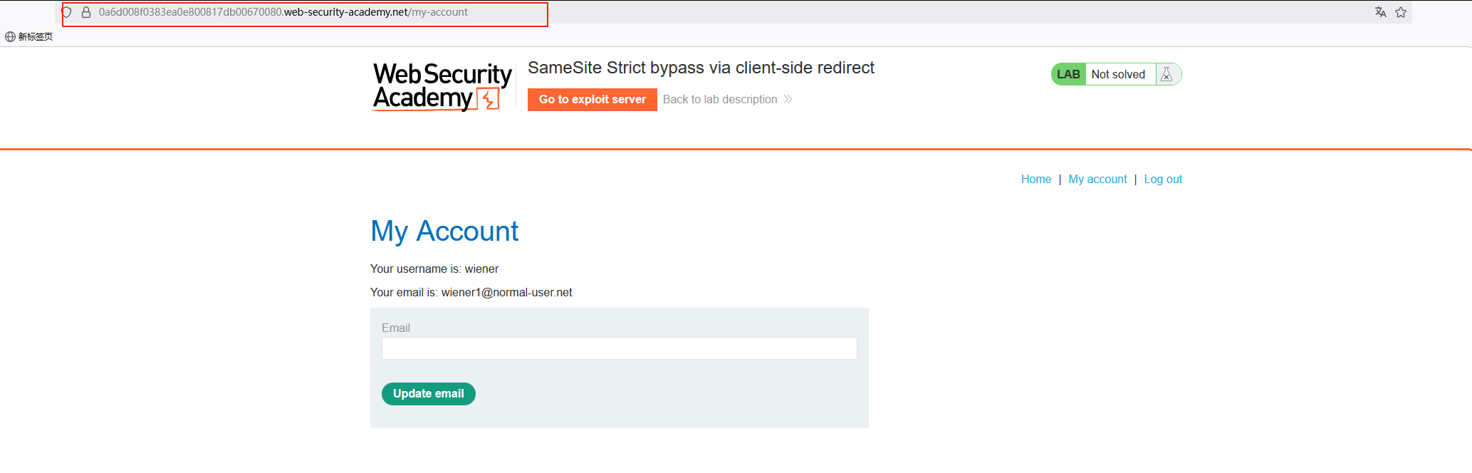 进入网页打开代理,登录靶场提供的账号,更新邮箱地址,在 BP 历史记录里面找到响应POST /login ,发现该网站在设置会话 Cookie 时未明确指定任何 SameSite 限制,浏览器将使用默认Lax限制级别