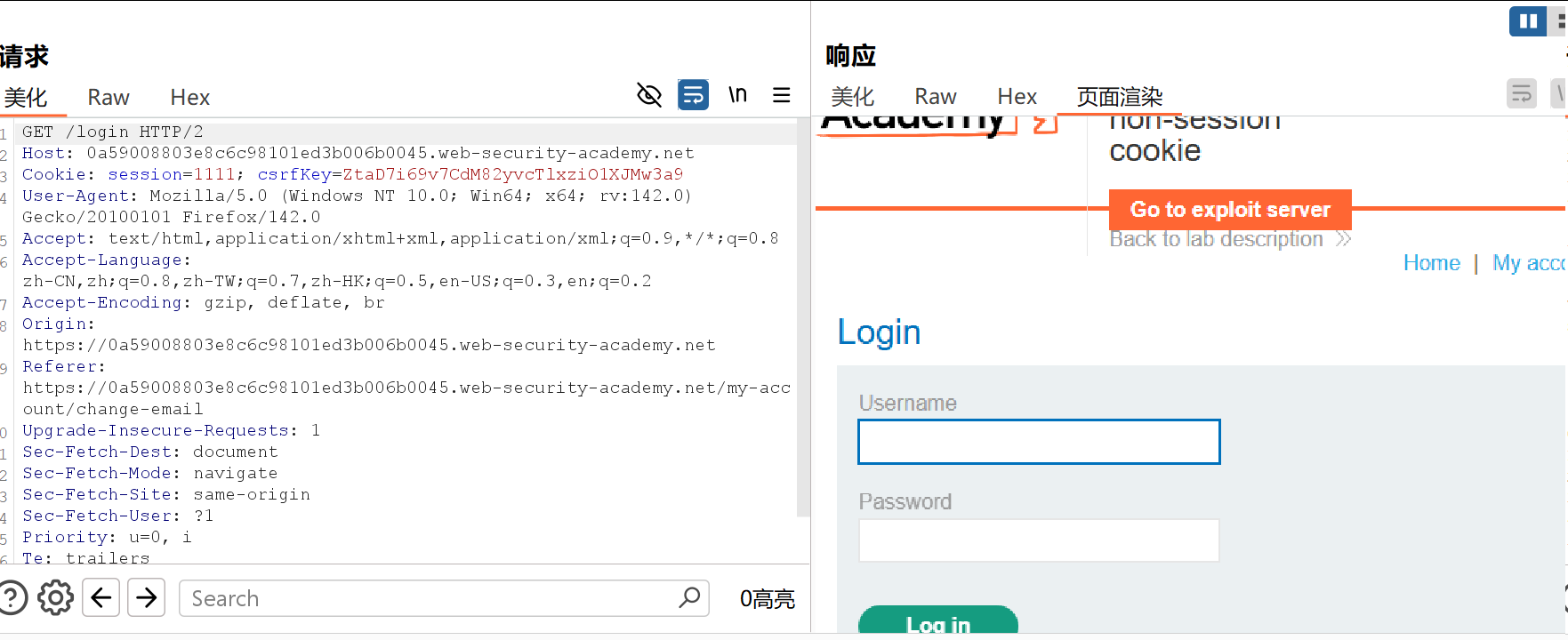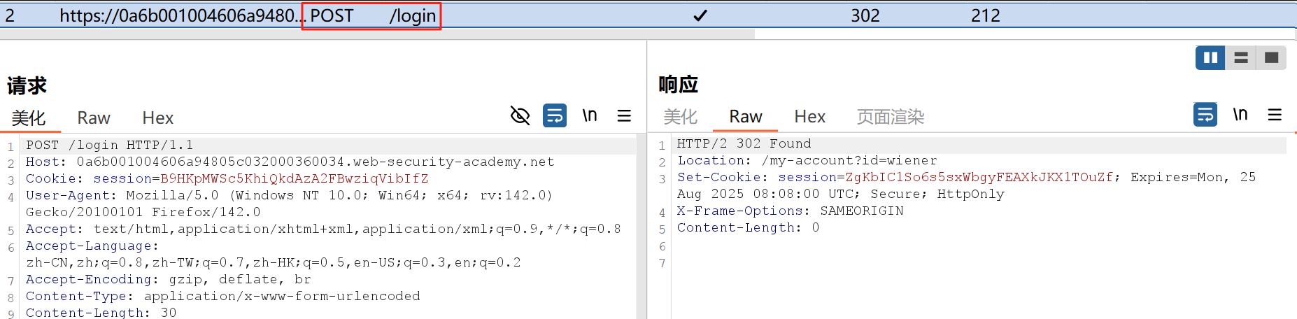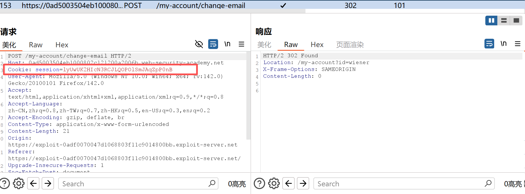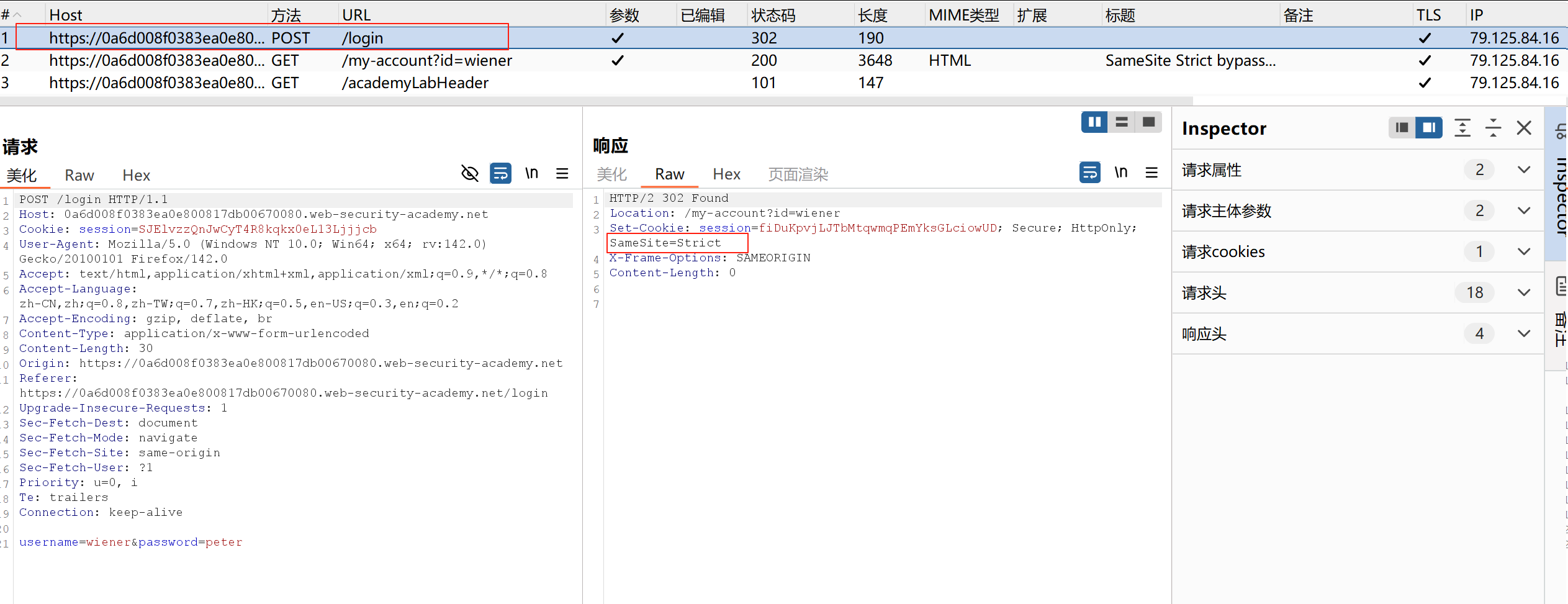 进入网页打开代理,登录靶场提供的账号,更新邮箱地址,在 BP 历史记录里面找到响应POST /login ,发现该网站在设置会话 Cookie 时明确指定了 SameSite=Strict 限制
