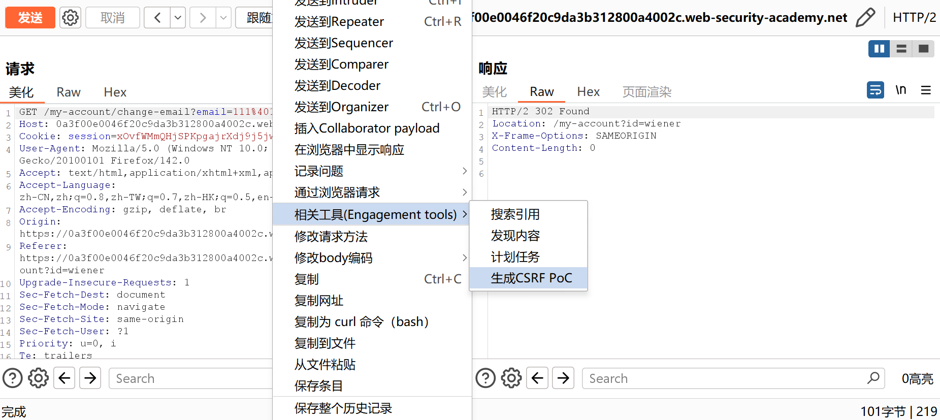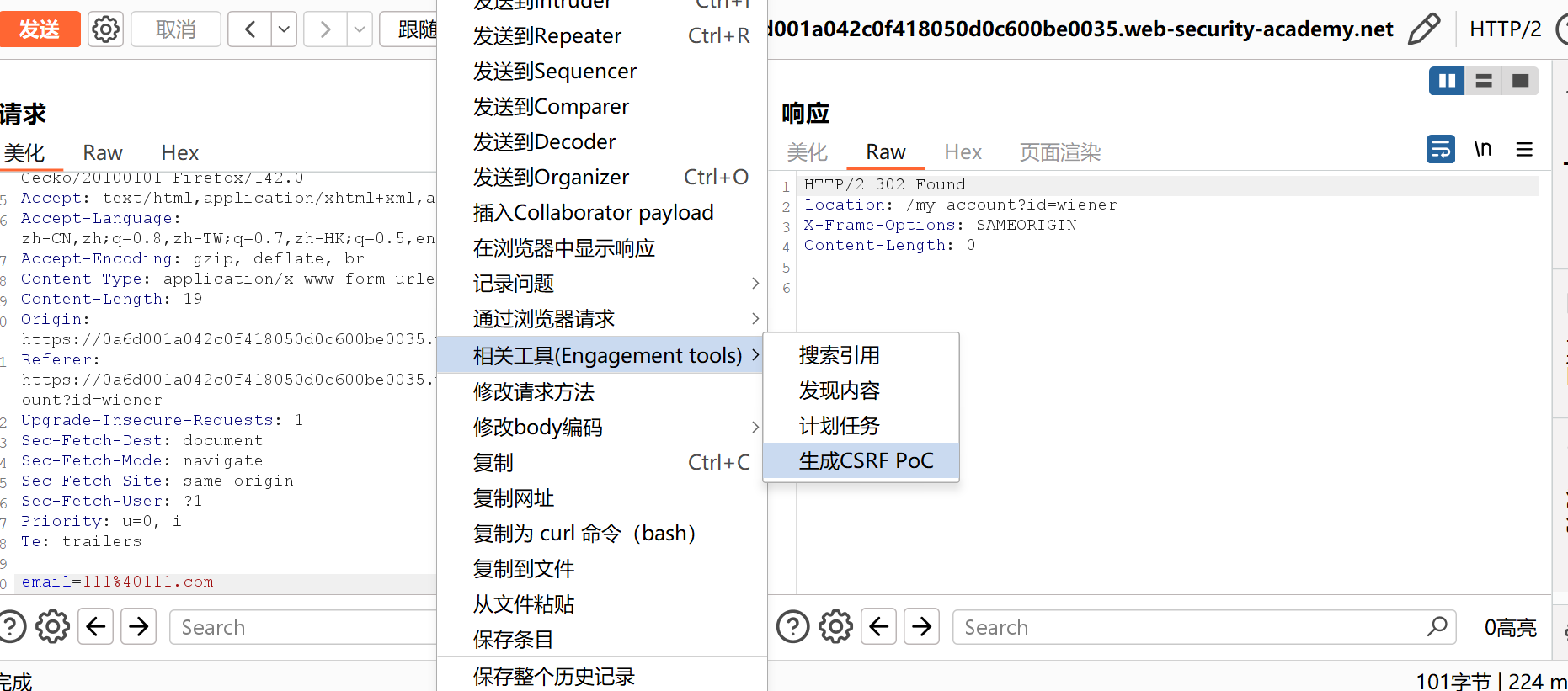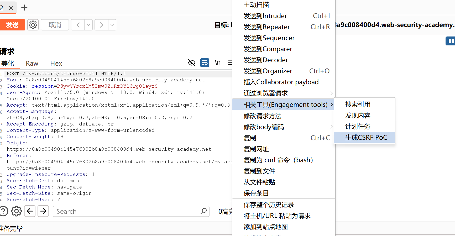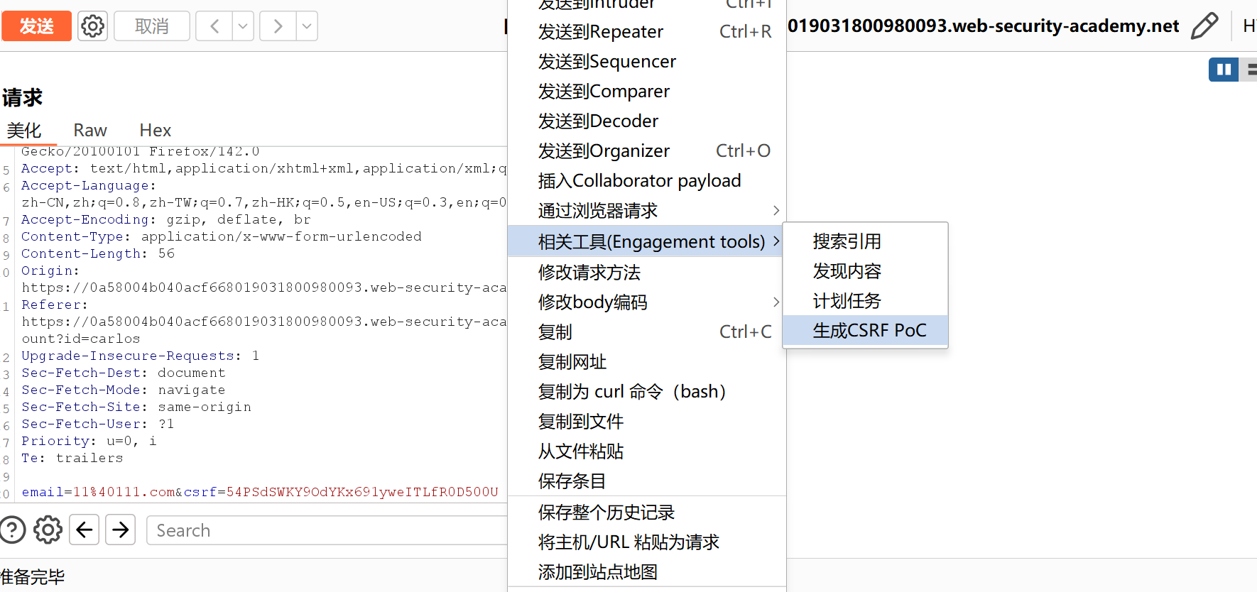 进入页面,登录靶场提供的账号登录。在更改邮箱处更改邮箱地址然后抓包,然后按下图所示操作生成 CSRF PoC 进行验证