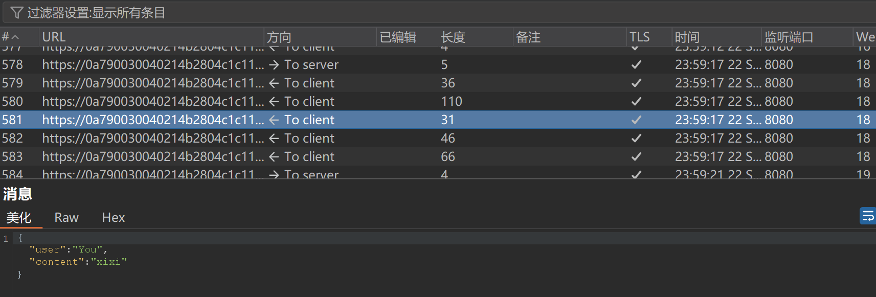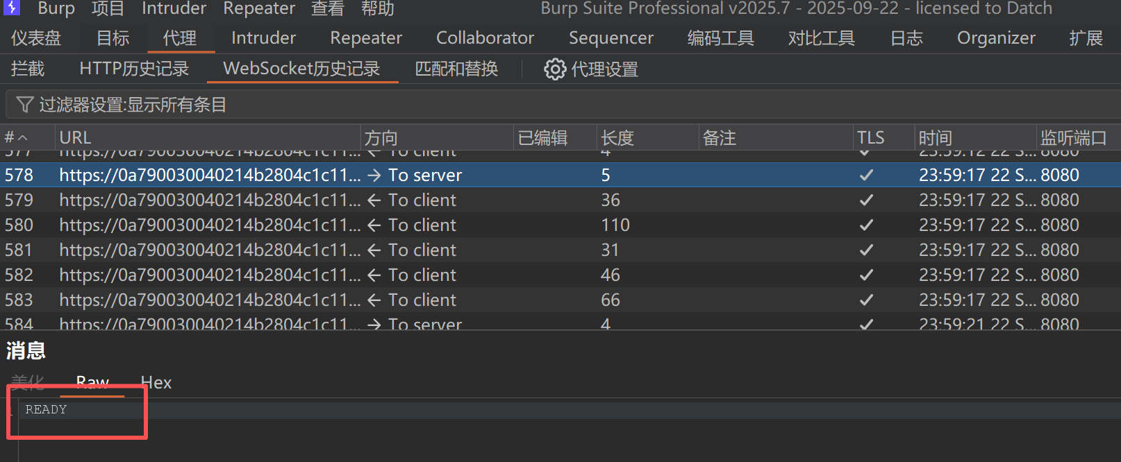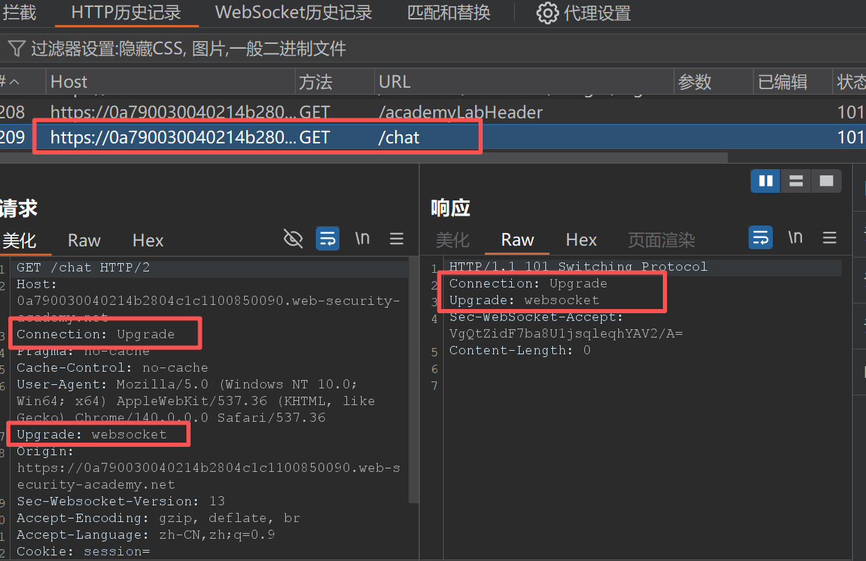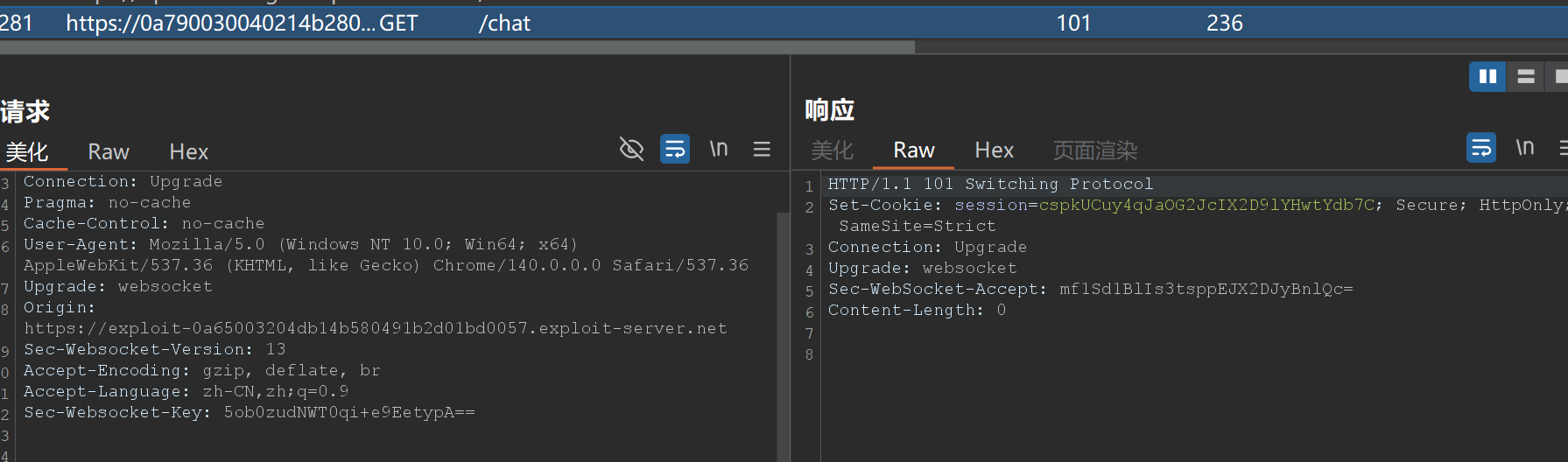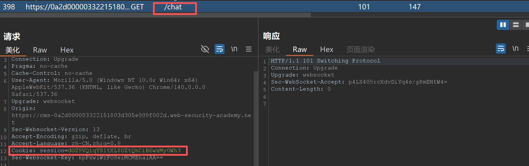 此时查看HTTP 历史记录可以发现脚本触发的 WebSocket 握手请求带上了会话 Cookie
