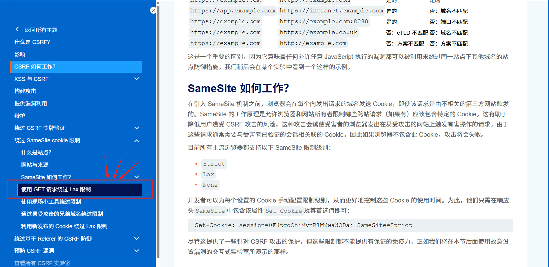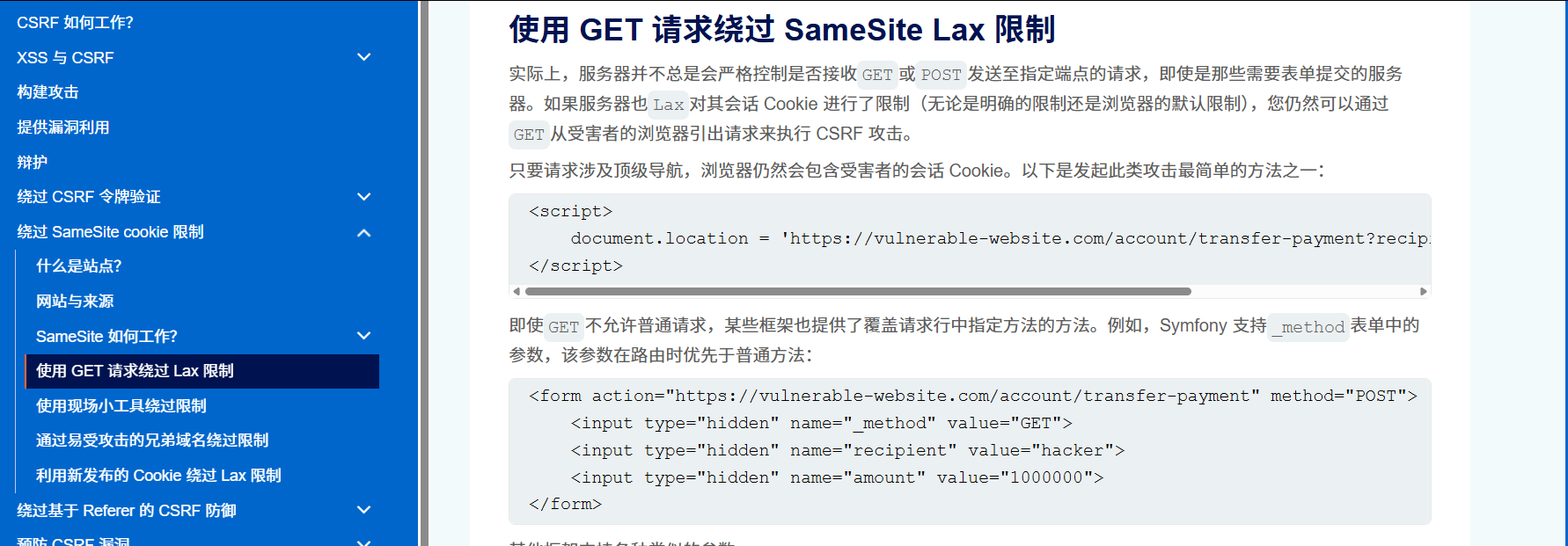 SameSite 是一个 Cookie 属性,用来控制 浏览器在跨站请求时是否发送 Cookie。它是为防御 CSRF(跨站请求伪造)、某些跨站信息泄露而设计的。(详细请查阅靶场主页相关介绍)