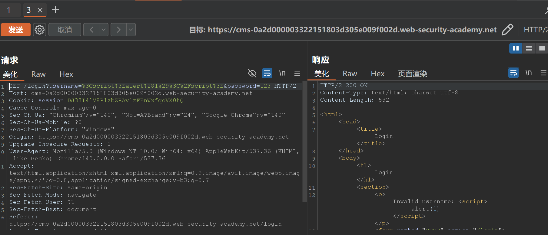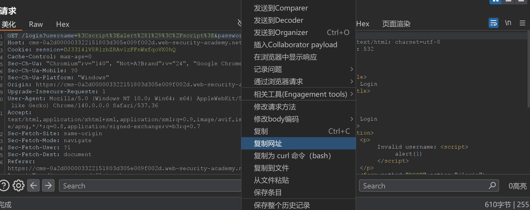 在漏洞服务器创建一个脚本,诱导受害者的浏览器发送你刚刚测试过的请求,但使用 URL 编码的 CSWSH 有效负载作为 username