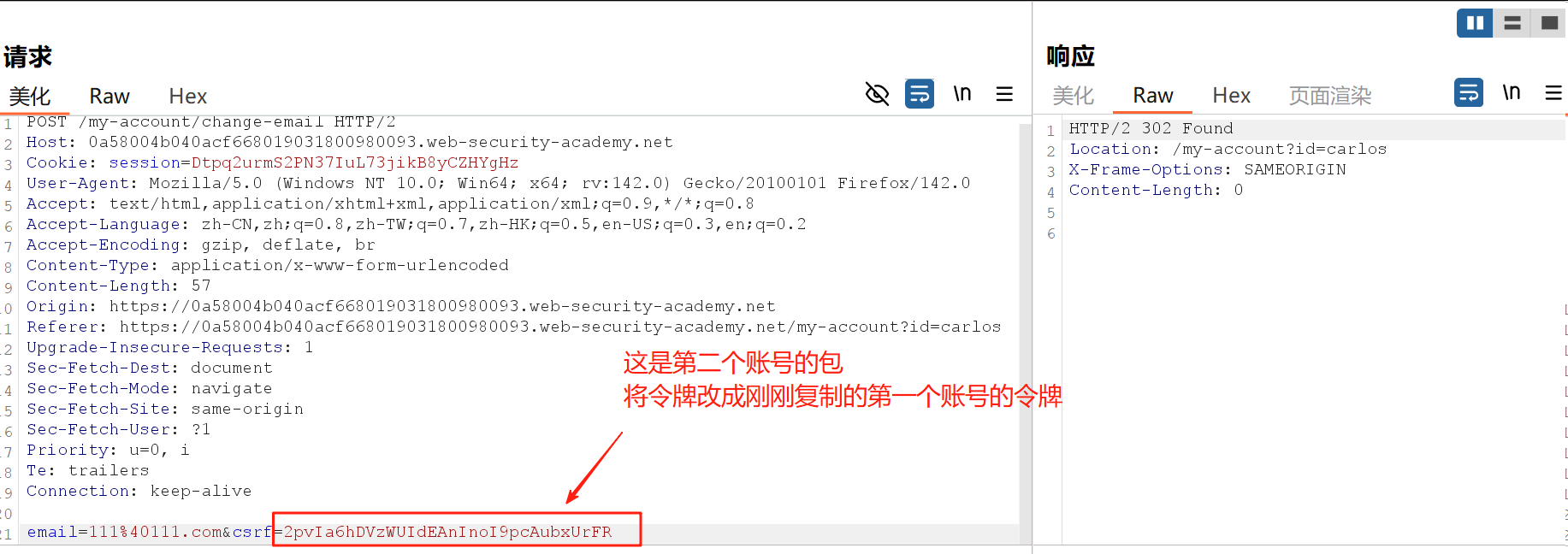 本题设置了令牌来阻止 CSRF 攻击,但是令牌并未集成到网站的会话处理系统中,它和用户的Session 并没有绑定关系。也就是说可能只要拿到一个合法的 token,就可以在别的会话里使用,而不会被拒绝。我们可以利用靶场提供的两个账号,抓到其中一个包之后将令牌另一个账号的令牌尝试能否绕过验证。(要注意CSRF 令牌是一次性的)