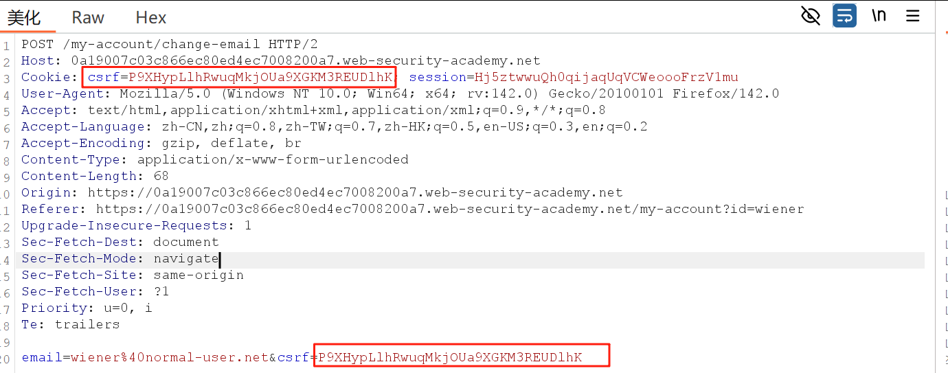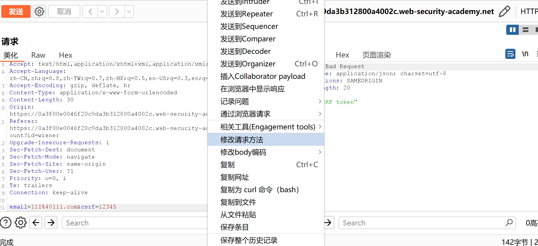 进入页面,登录靶场提供的账号,修改邮箱地址并利用 BP 抓包,发送到 Repeater 然后把包丢弃关闭拦截,开始尝试修改 csrf 令牌值。