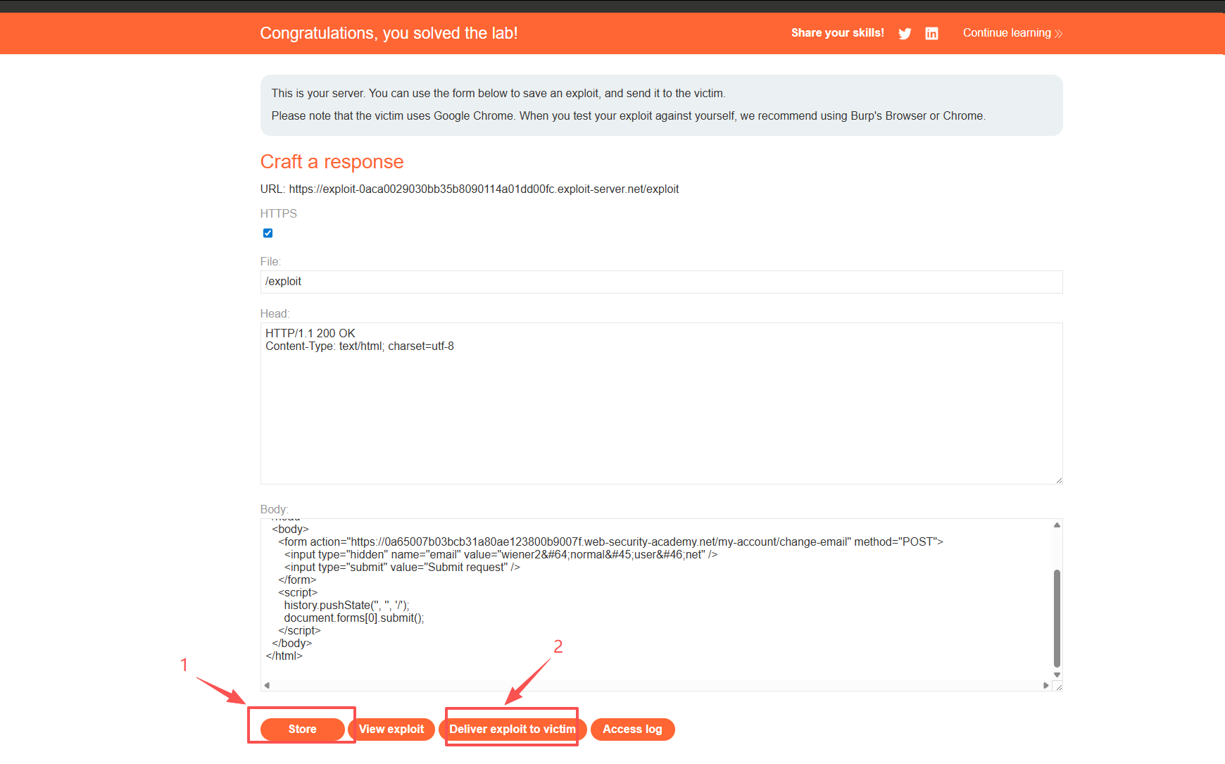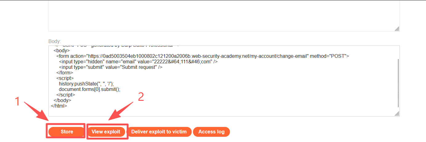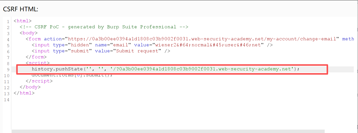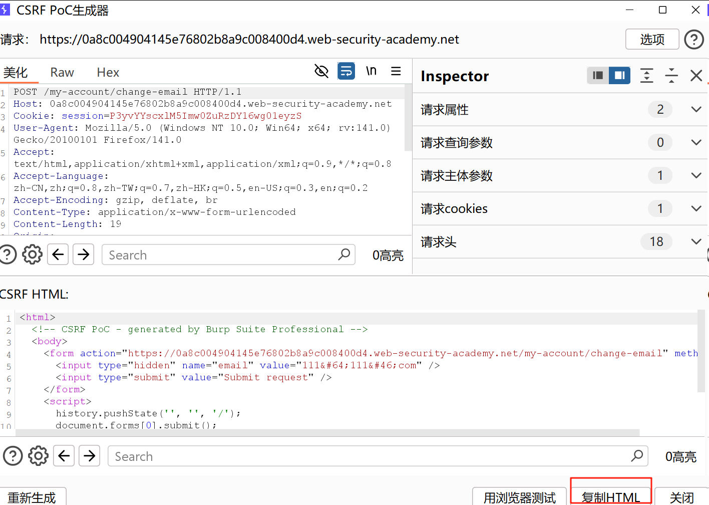 生成后复制 HTML ,写入靶场提供的服务器,然后发送给受害者 (注意邮箱地址要与当前的账号邮箱不同)