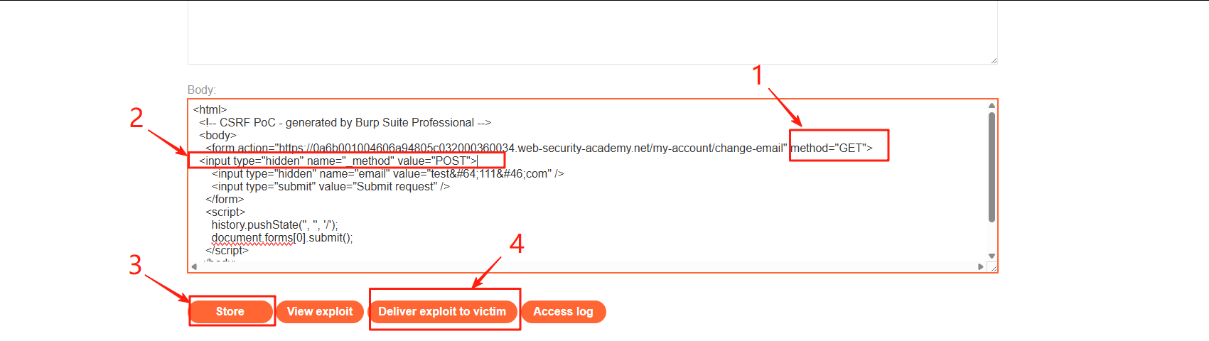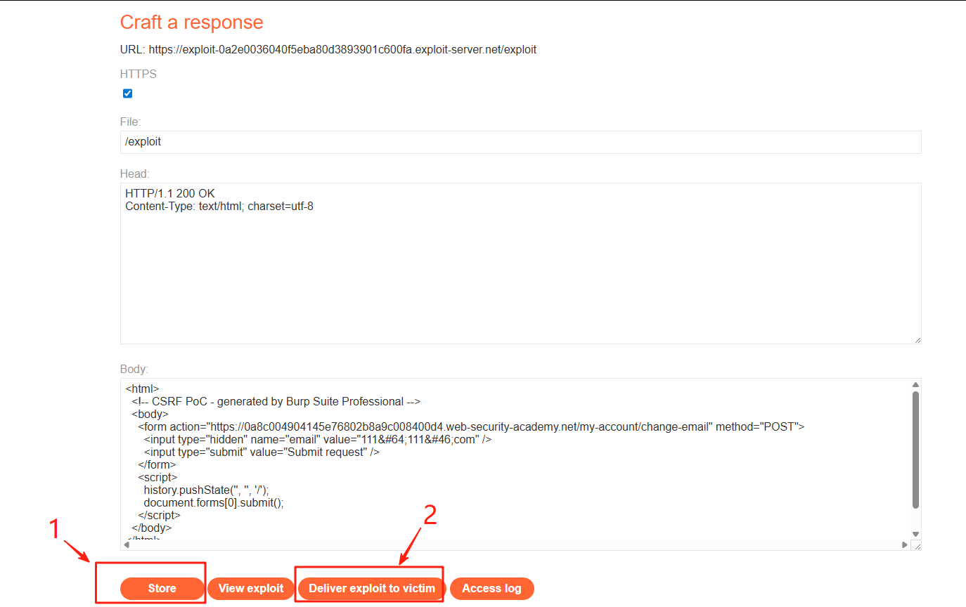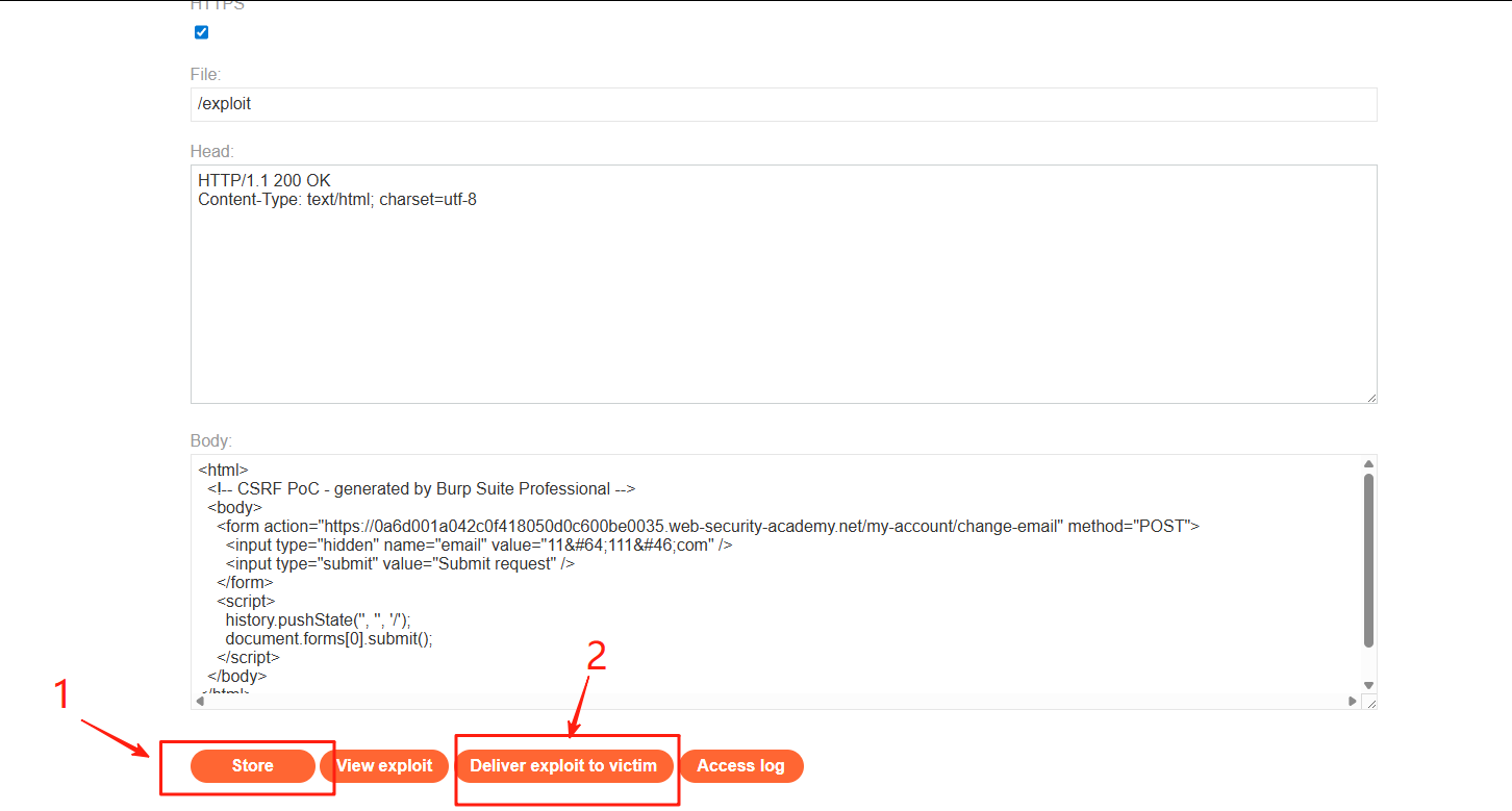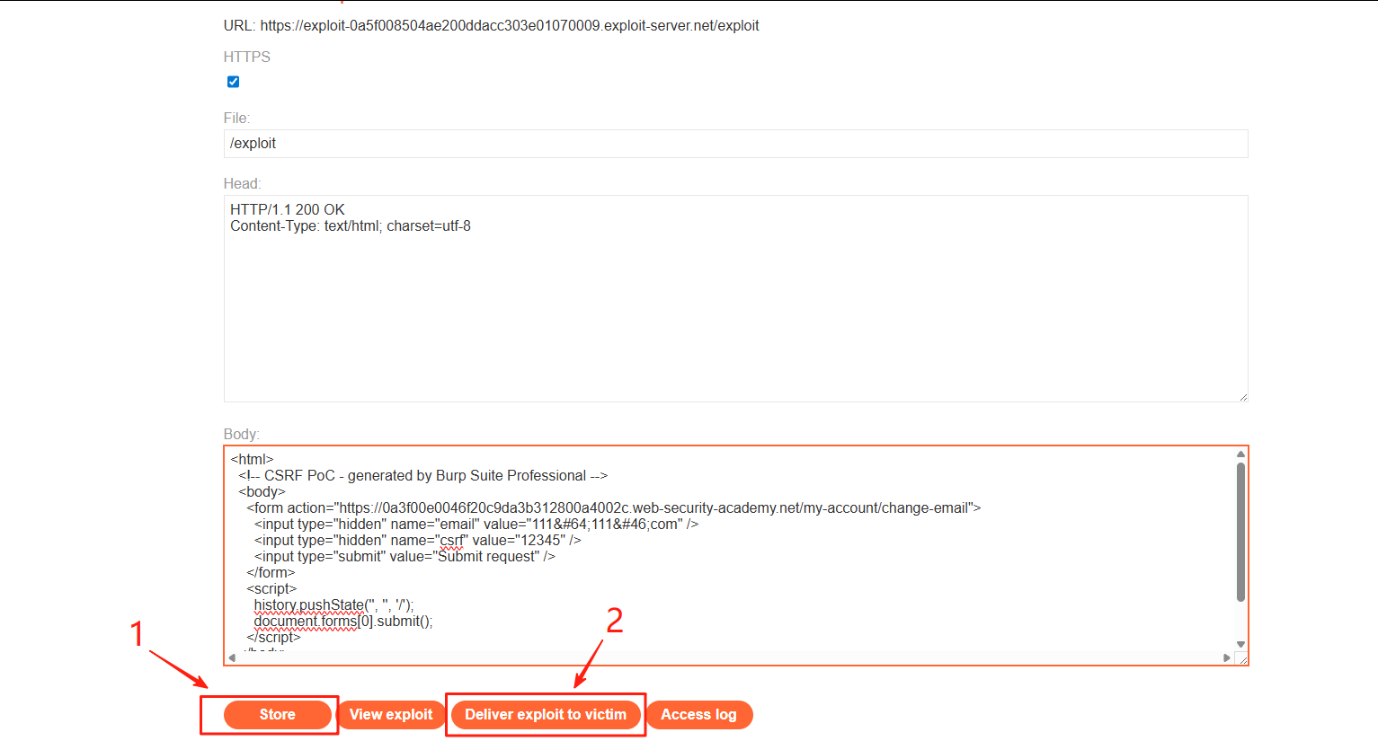 生成后复制 HTML ,写入靶场提供的服务器,然后发送给受害者 (注意邮箱地址要与当前的账号邮箱不同)