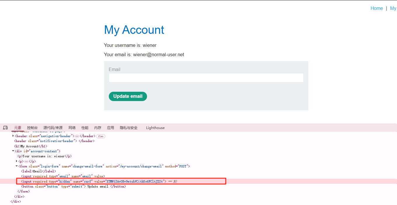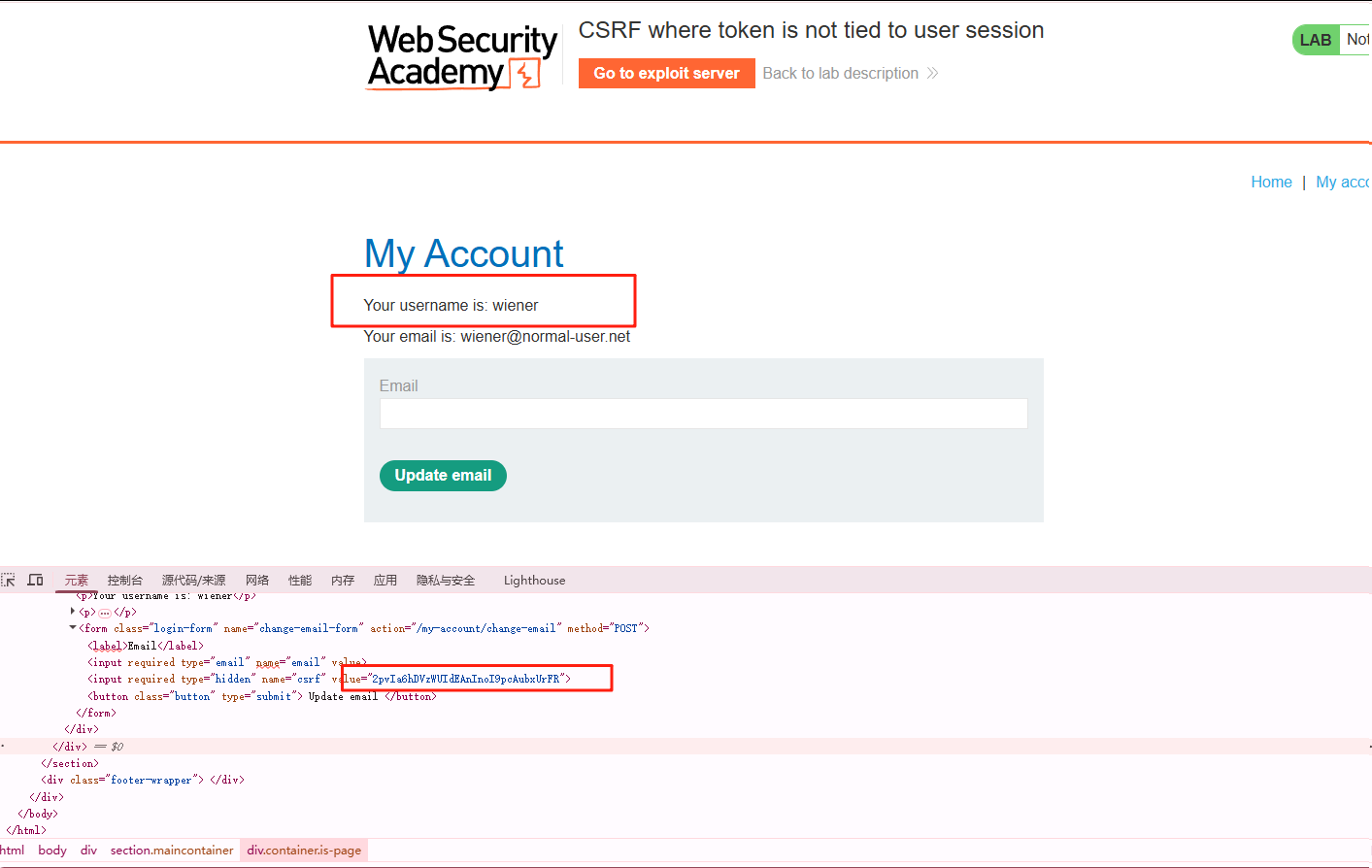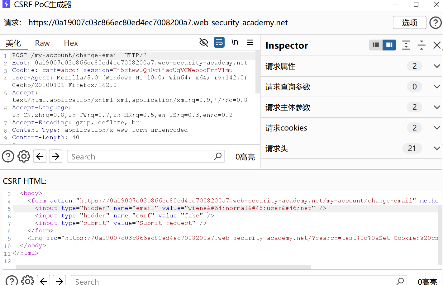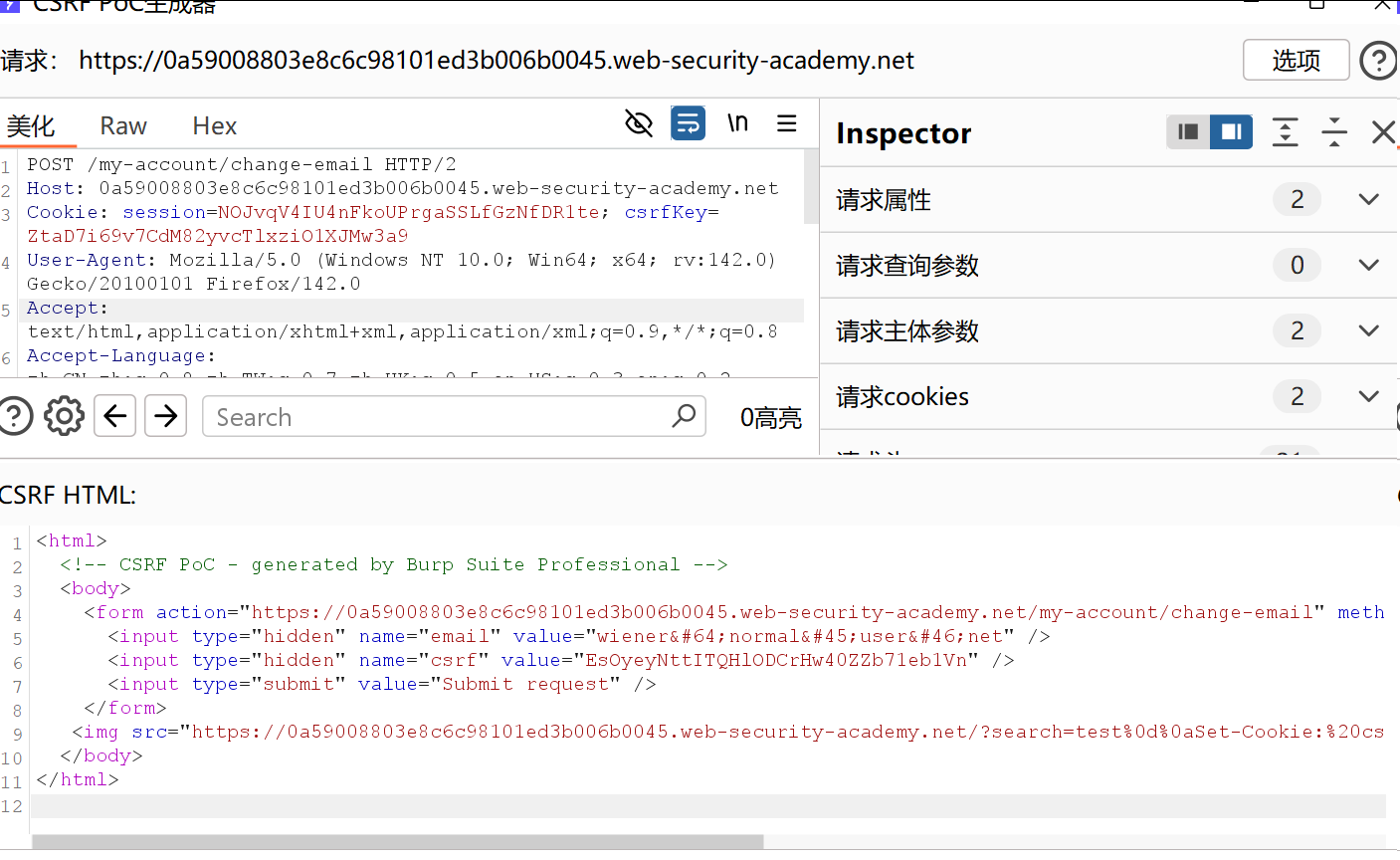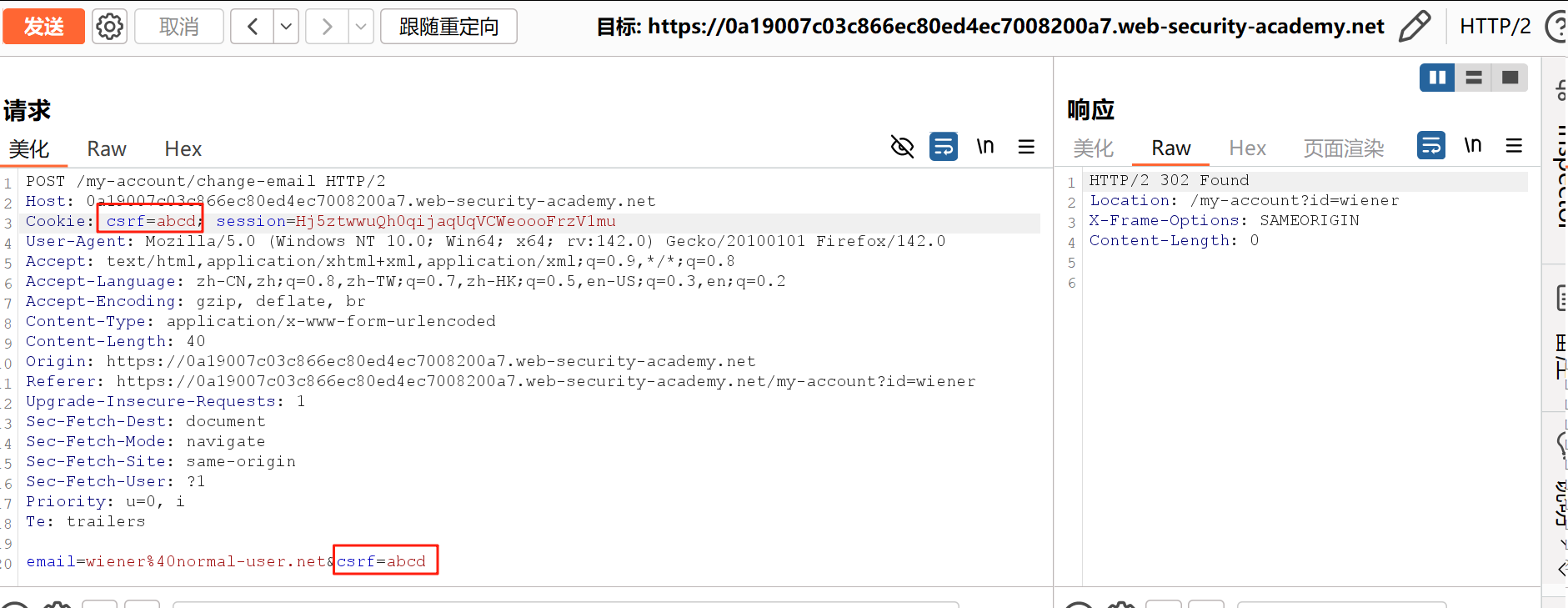 本题 cookie 中存在重复的 token ,试图利用不安全的“双重提交”CSRF 预防技术。而经过测试可以发现,令牌并不与会话绑定,而是通过验证两个令牌值是否一致来判断令牌是否正确。其中一个令牌被写在响应头处,一个通过表单提交。此时只需要在进行普通 CSRF 攻击时,写入响应头的令牌值,令两个令牌值一致即可绕过。