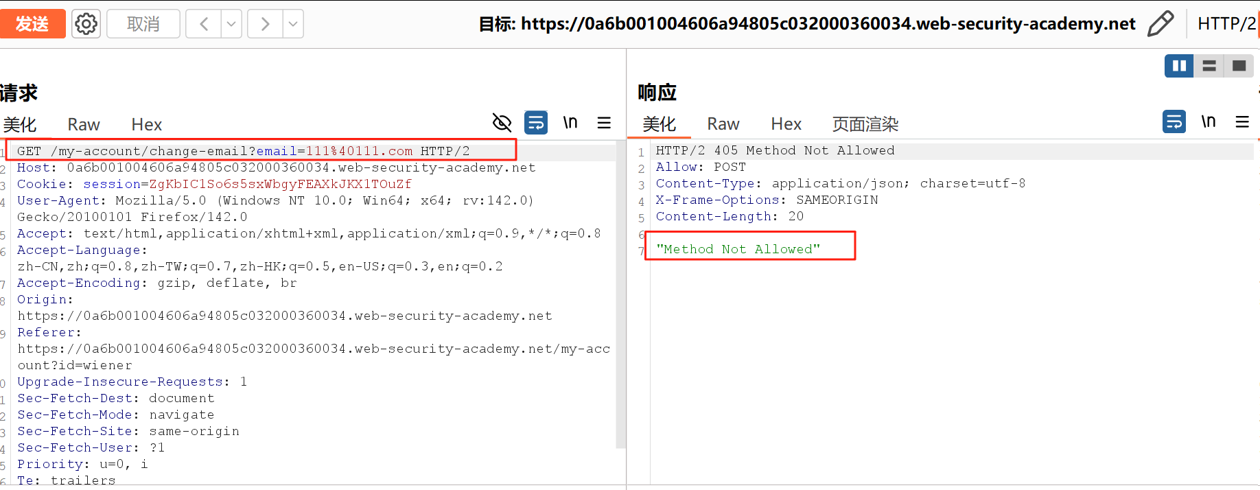 找到更改邮箱地址的响应包,绕过Lax限制,需要GET请求且涉及顶级导航,但是直接更改请求方式是不行的