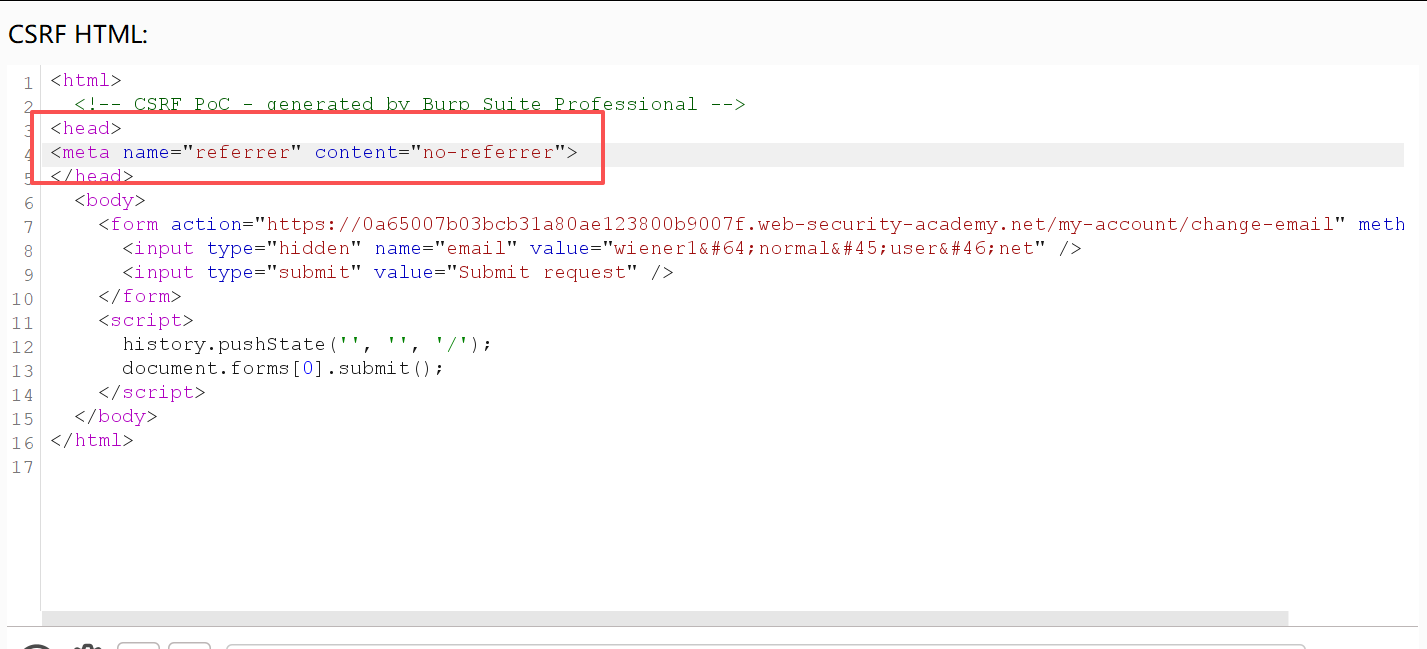 由此可知,可以通过抑制 Referer 标头来绕过限制。重新抓一个修改邮箱地址的请求包,生成 PoC,添加此代码