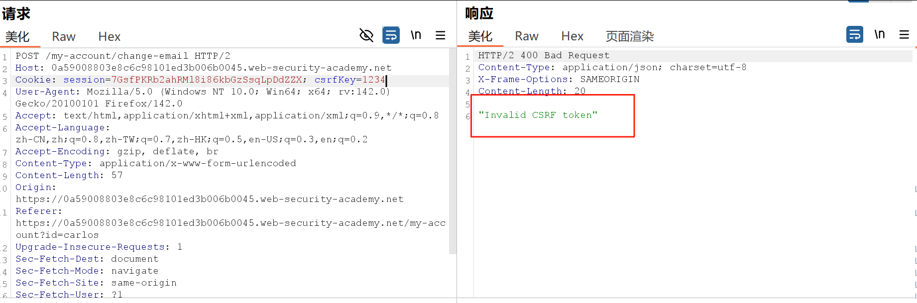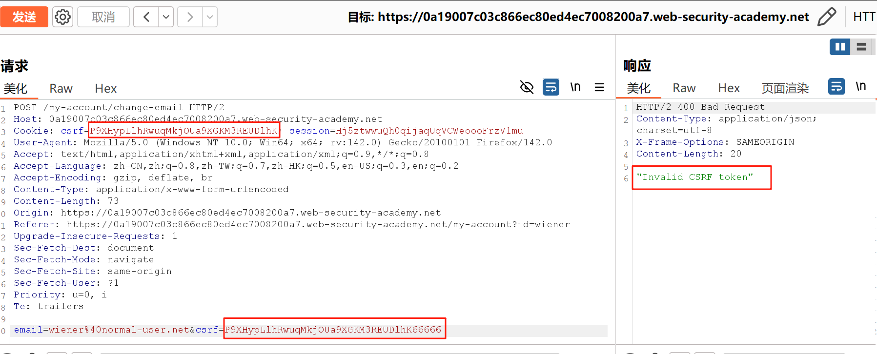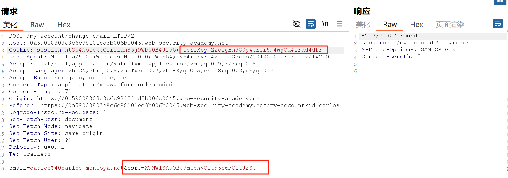 此时发现更改 csrfKey 仅仅会导致 CSRF 令牌被拒绝,猜测令牌可能与 csrfKey 参数绑定。此时尝试用用户 wiener 的 csrfKey 和 令牌 替换用户 carlos 的令牌