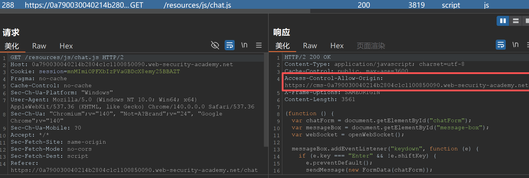 此时可以确定 CSWSH 漏洞,但是泄露的是全新的聊天记录。回到 BP HTTP 历史记录,找到由脚本触发的 WebSocket 握手请求,发现会话 cookie 未随请求发送。