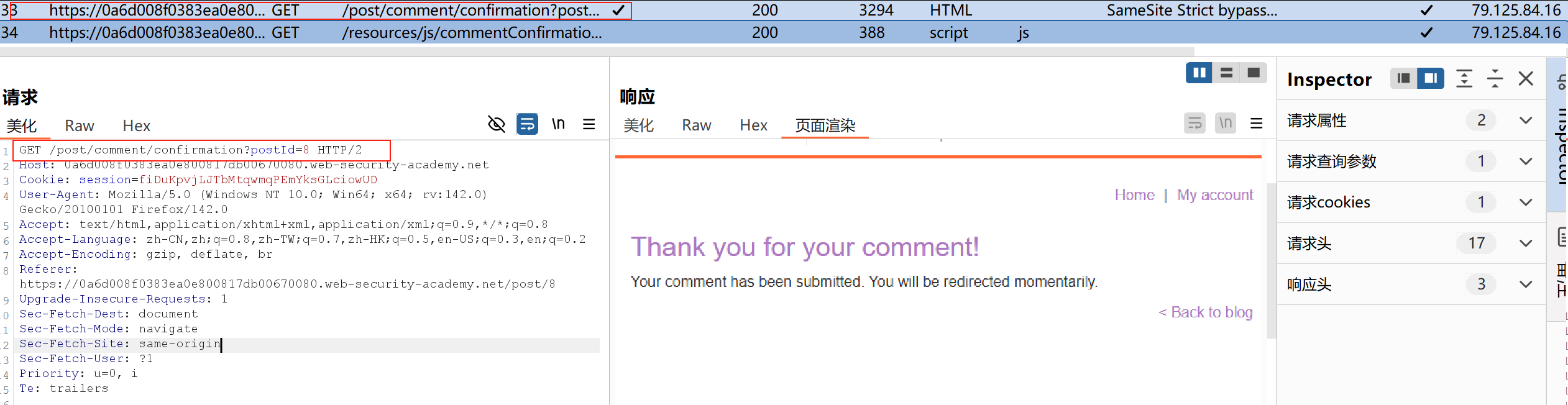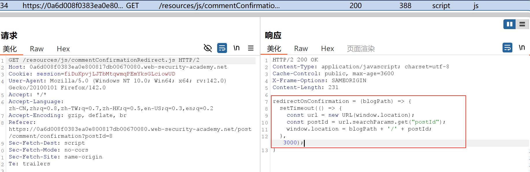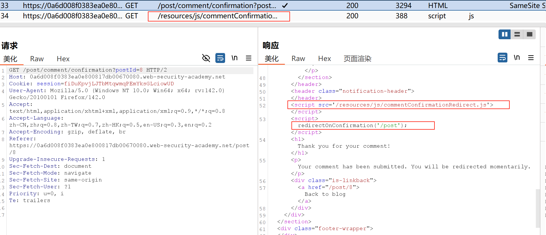 在浏览器中,打开其中一篇博客文章并发表一条任意评论。你会发现,你最初会被跳转到一个确认页面,/post/comment/confirmation?postId=x但几秒钟后,你又回到了博客文章页面。在 Burp 中,转到代理历史记录并注意此重定向是使用导入的 JavaScript 文件在客户端处理的 /resources/js/commentConfirmationRedirect.js。