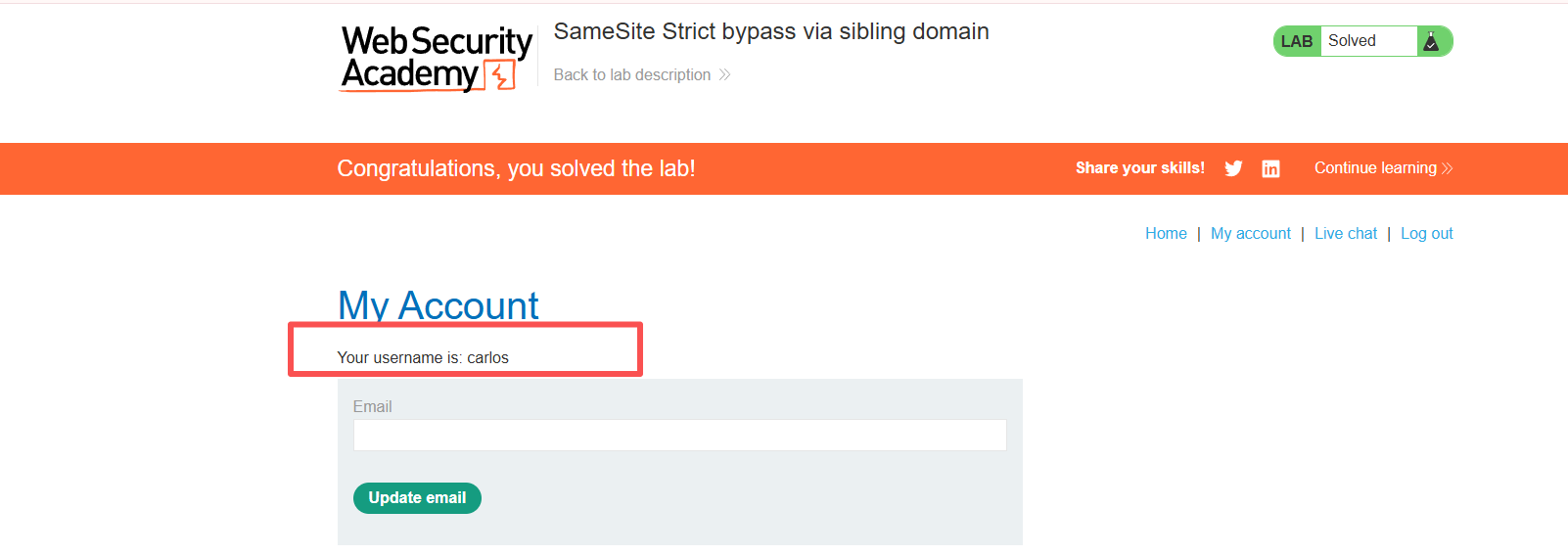 写入靶场提供的服务器,保存后查看漏洞,可以发现邮箱地址被修改,查看代理历史,可见发送的change-email 请求中会带 cookie
