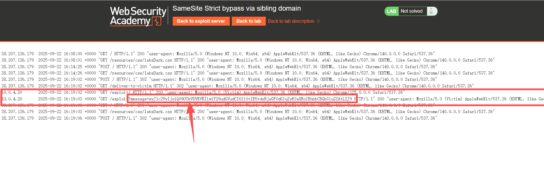 本题是 SameSite=Strict 的限制,只有用户在 同站点内导航(比如点击站内链接)时,Cookie 才会被带上。通过客户端重定向绕过,浏览器认为跨站 → 同站的“链式跳转”是用户主动行为的一部分,因此最后一步的请求可能会带上 Cookie。受害者访问恶意站点,恶意站点返回一个网页,里面用JavaScript做客户端重定向,跳转到另一个页面,这时 SameSite=Strict 的限制可能会被绕过,Cookie 会被附带。