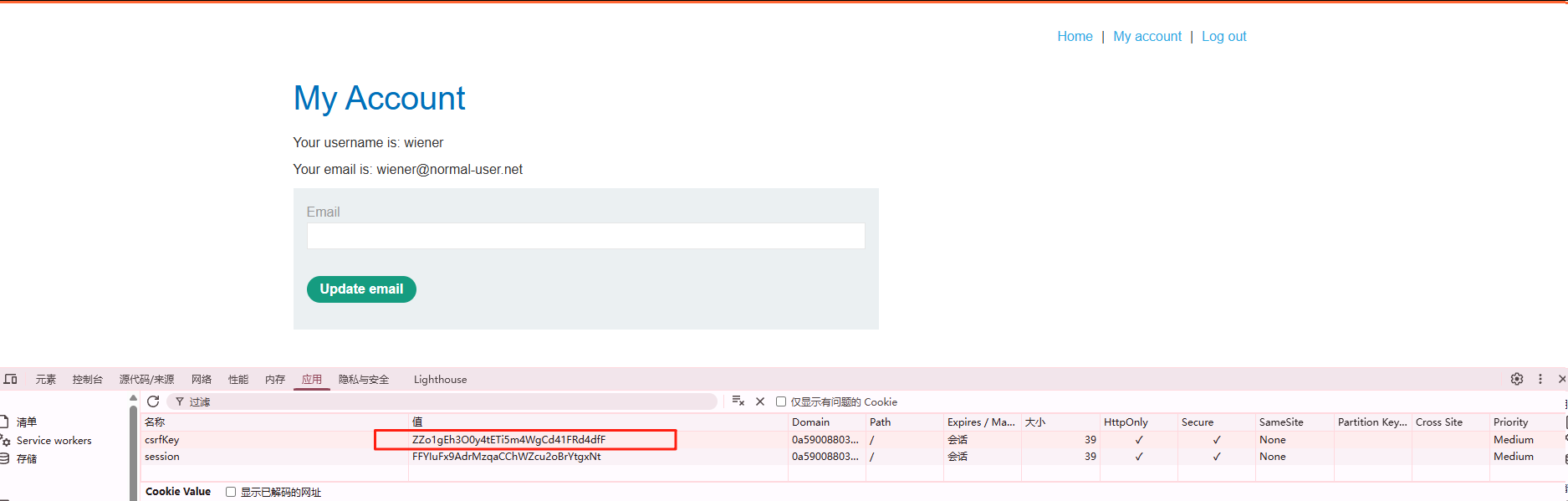 本题令牌并未完全集成到网站的会话处理系统中,抓包之后会发现 cookie 中多了一个参数 csrfKey,经过测试可以发现 csrfKey cookie 可能与会话没有严格的关联,而令牌可能是与参数csrfKey 关联而不是与 session 绑定,可以利用这一点绕过限制。